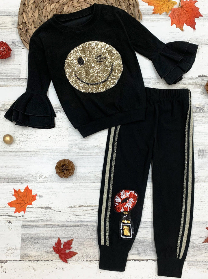 - Set features a double ruffled sleeve pullover sweatshirt with emoji face or rainbow applique and a striped trim on the side of joggers pants
