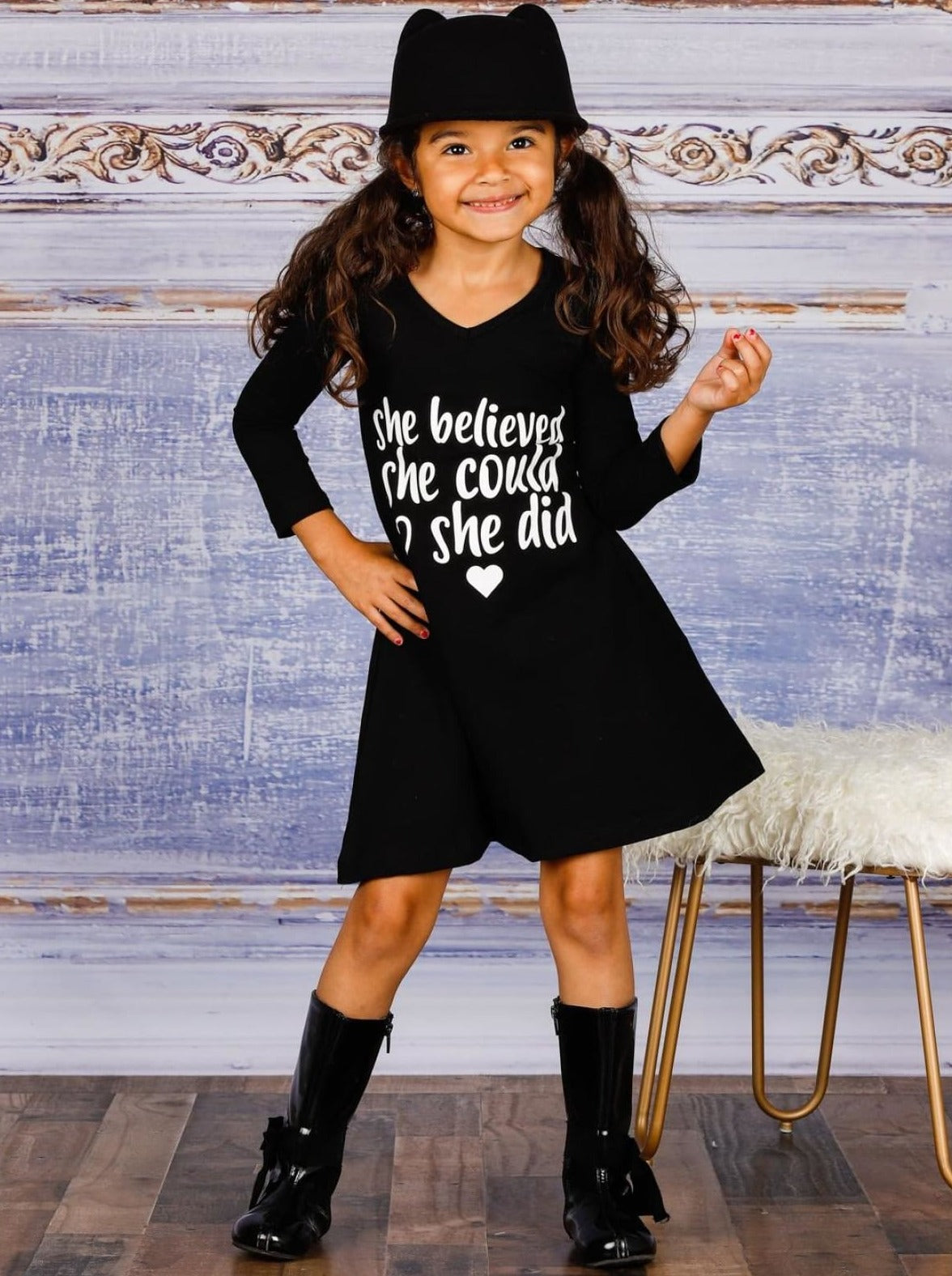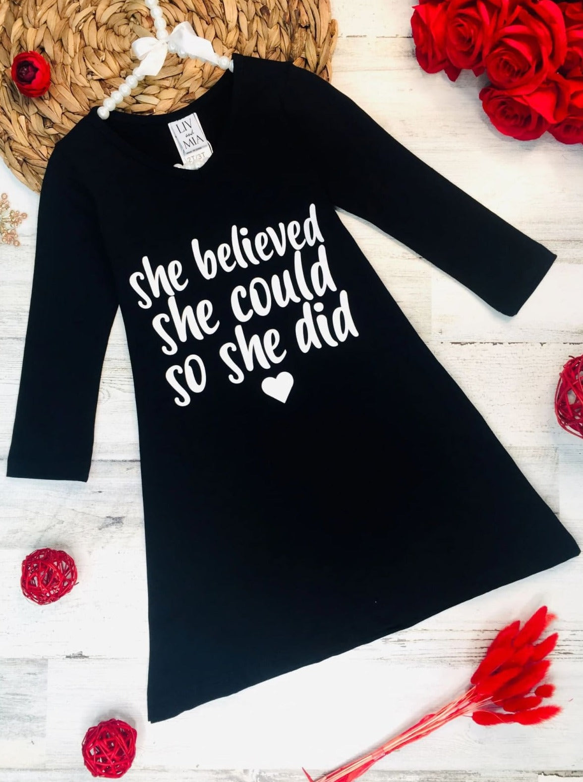 Long-sleeve A-line dress with "She believed she could so she did" graphic text