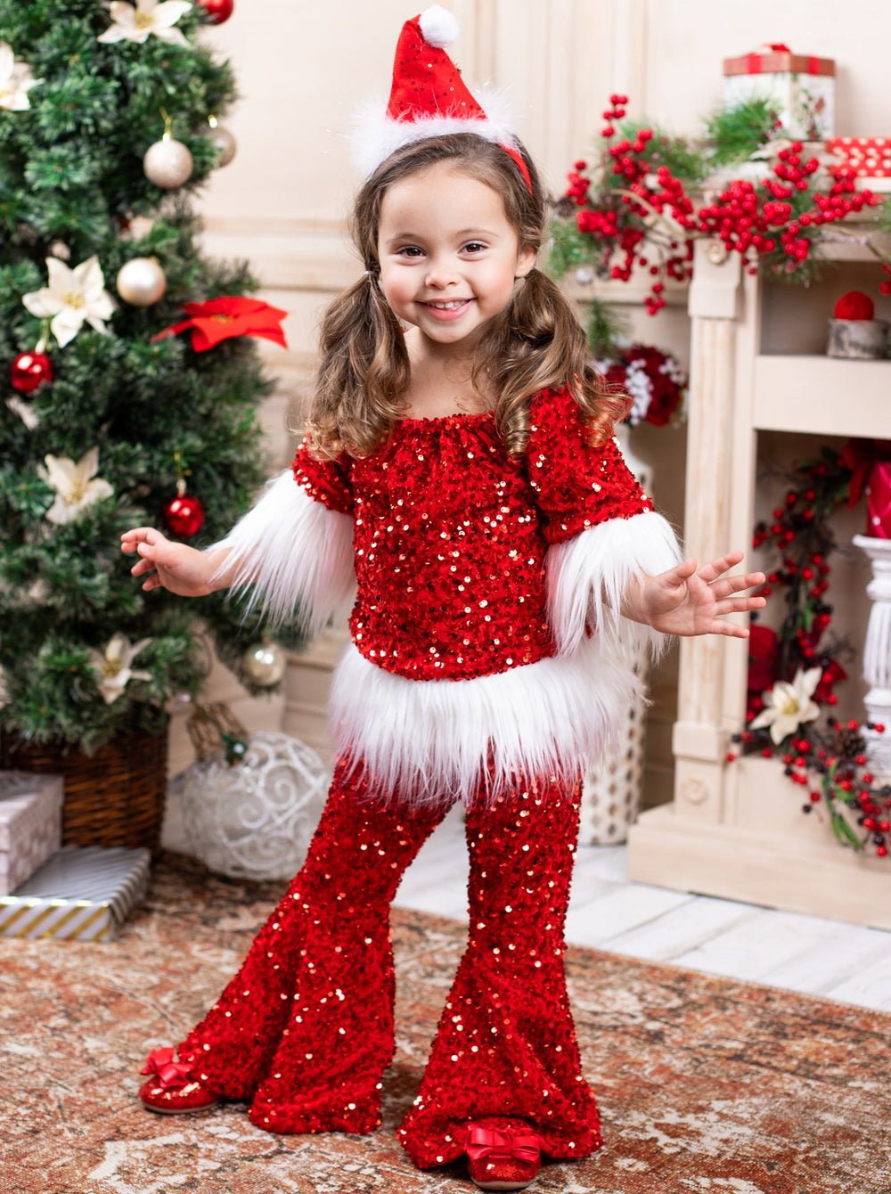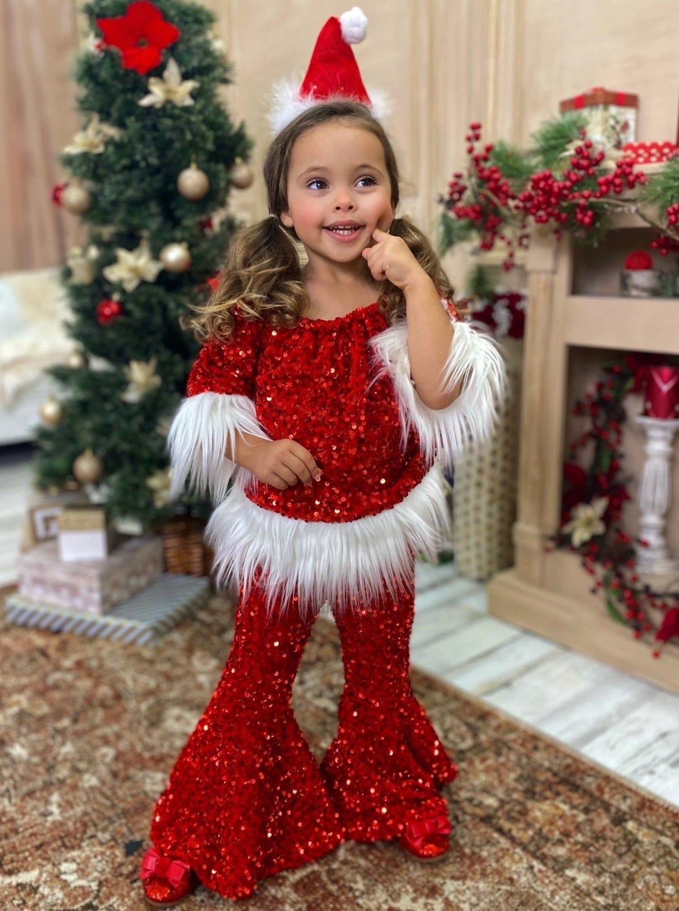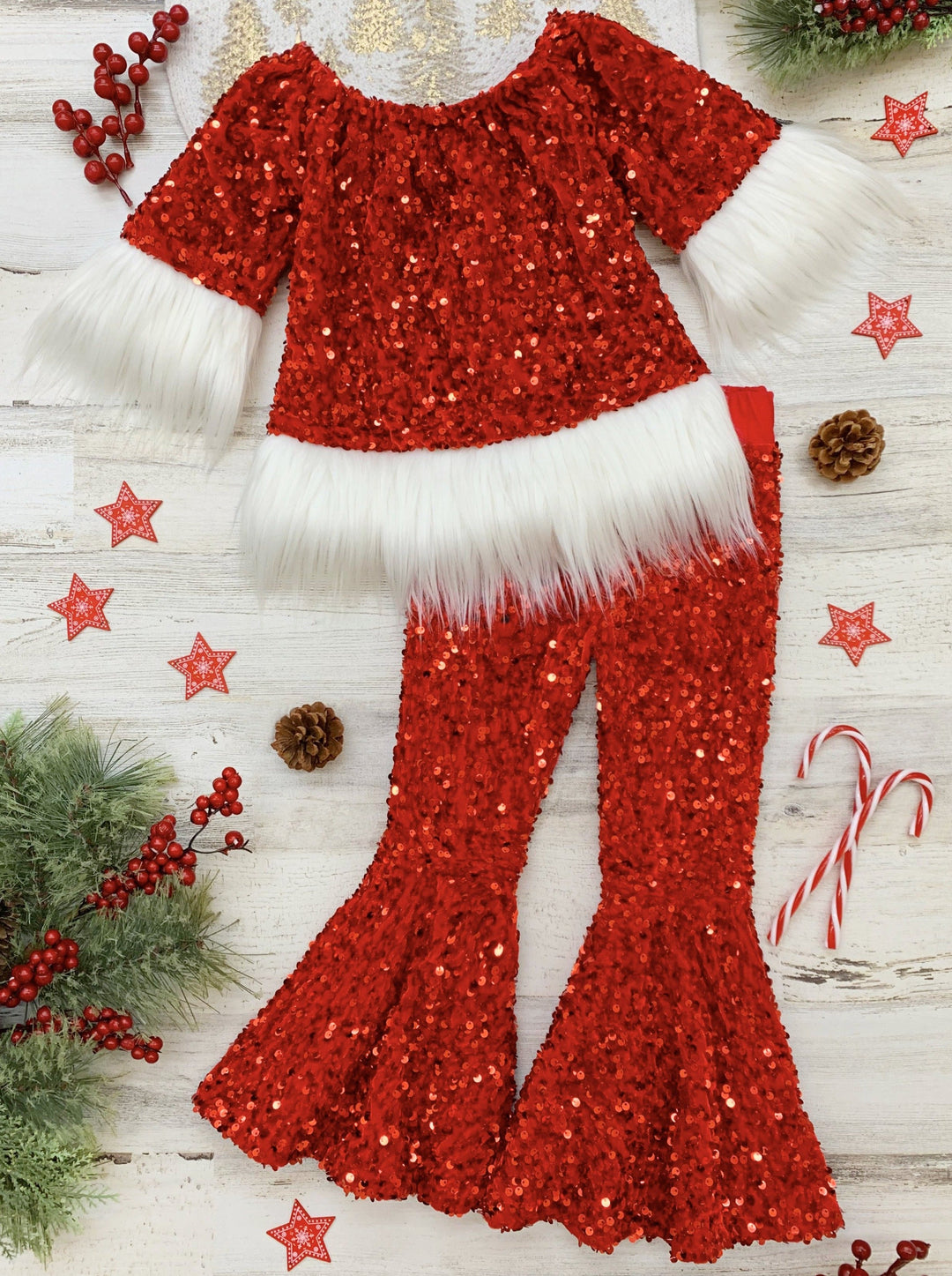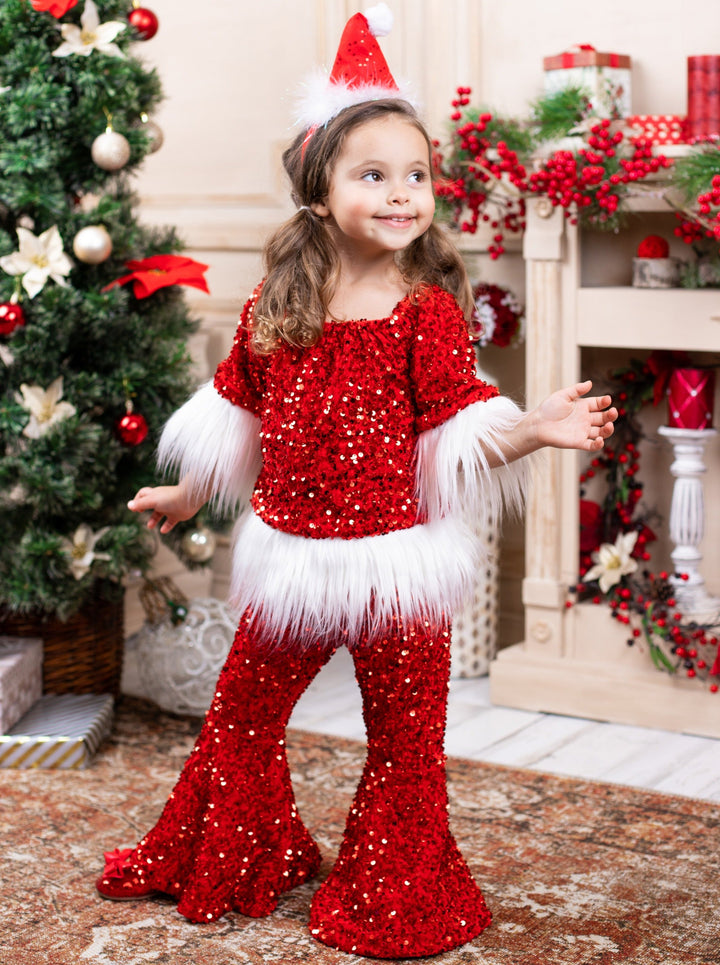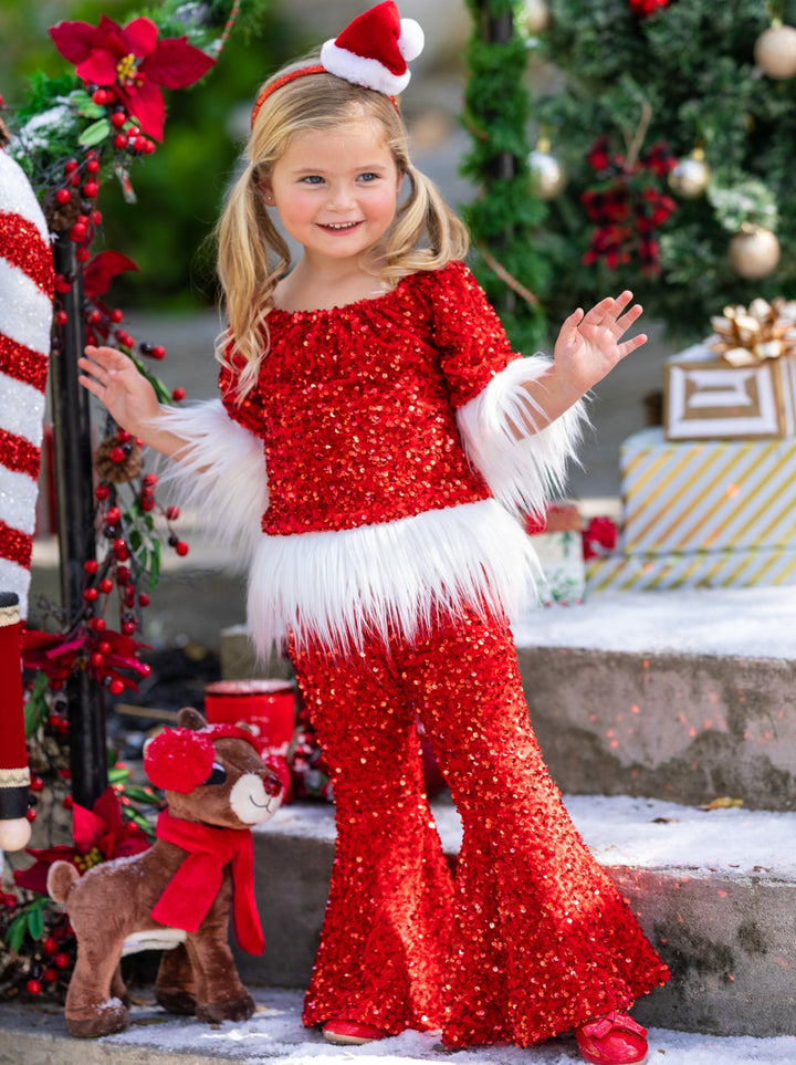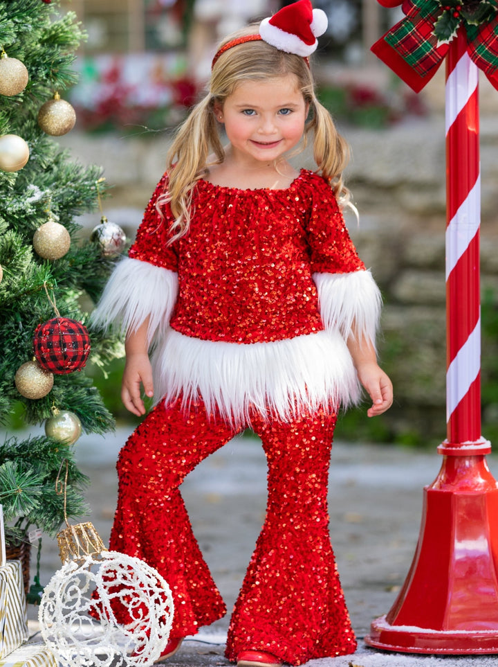 Santa baby, 'tis the season for adorable sparkles! This red sequin bell bottom set with white faux fur trim is too cute for every Christmas activity and looks oh-so-perfect for your family picture! Soft, shimmery, and made for your cutie!