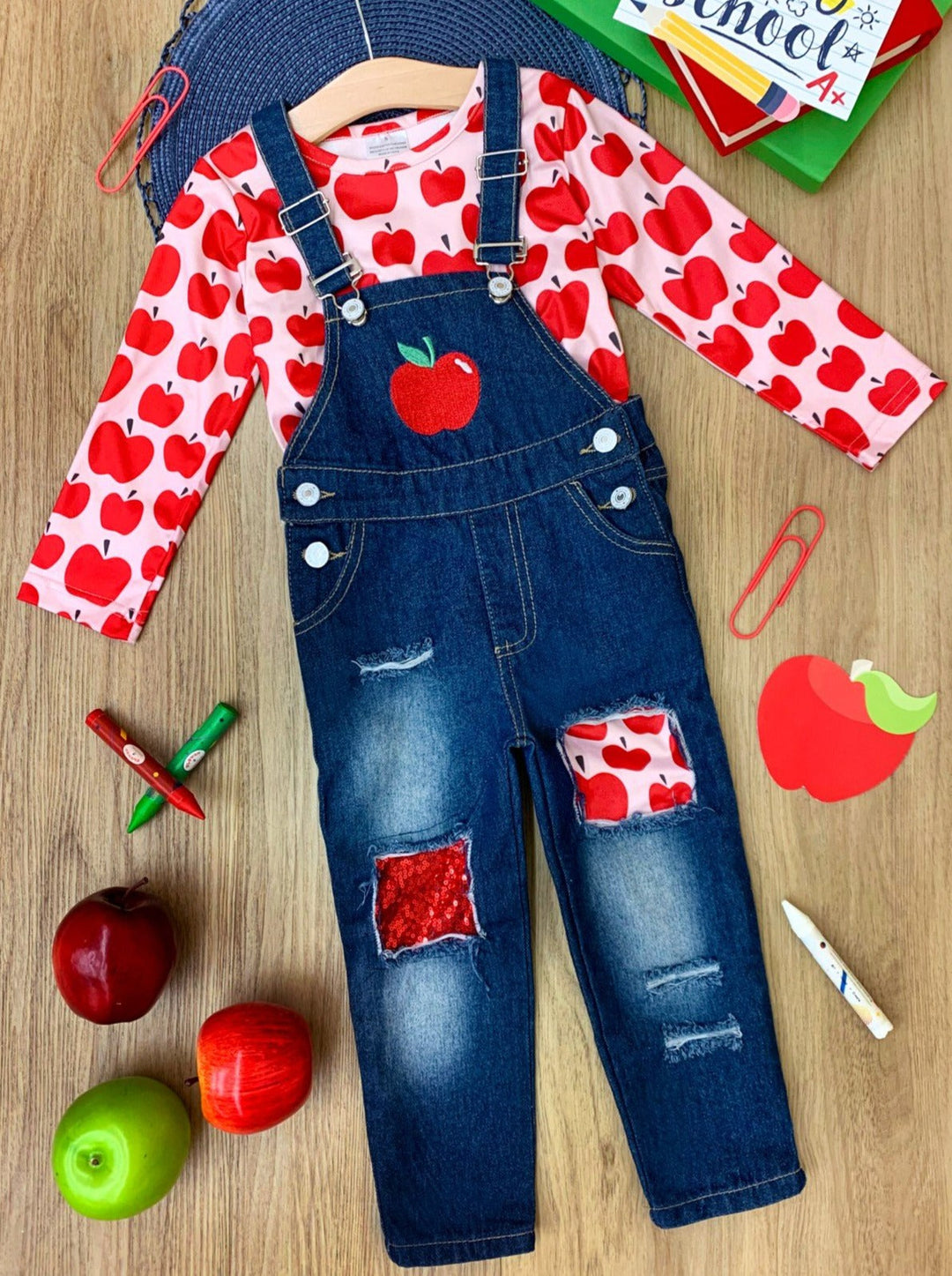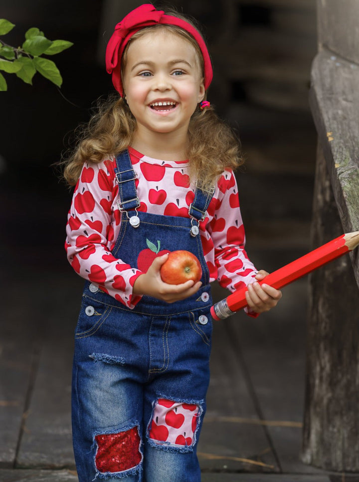 • She’ll most definitely ACE her fashion test in this adorable, apple print denim overall set! She'll look as sweet as can be on her first day back to school. Try not to cry, mom!
