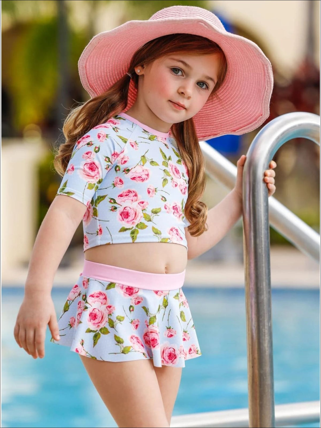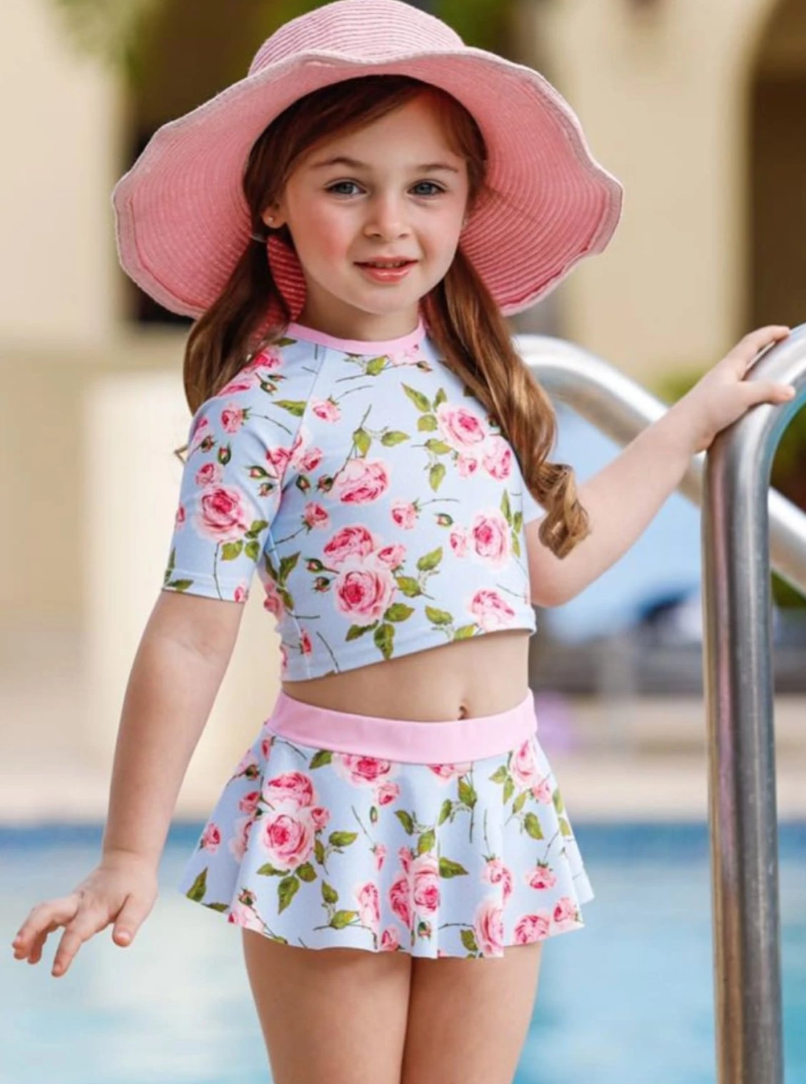 - Shield her skin from the sun and release her inner surfer with this feminine rash guard two-piece swimsuit that features a short sleeve top for light coverage and matching skirt bottom for twirls!