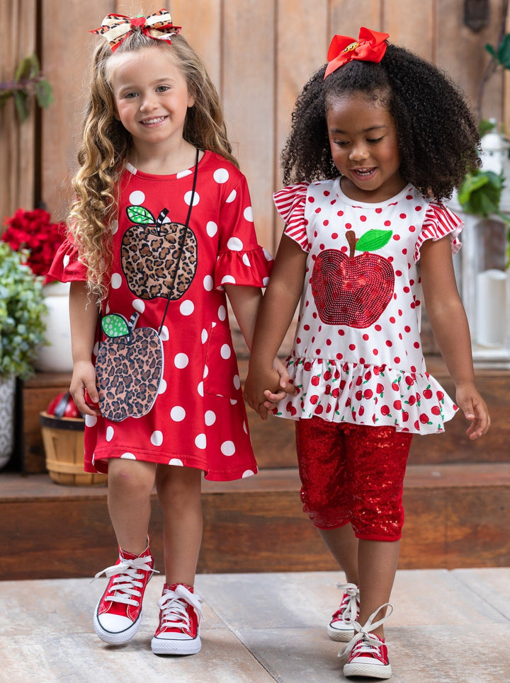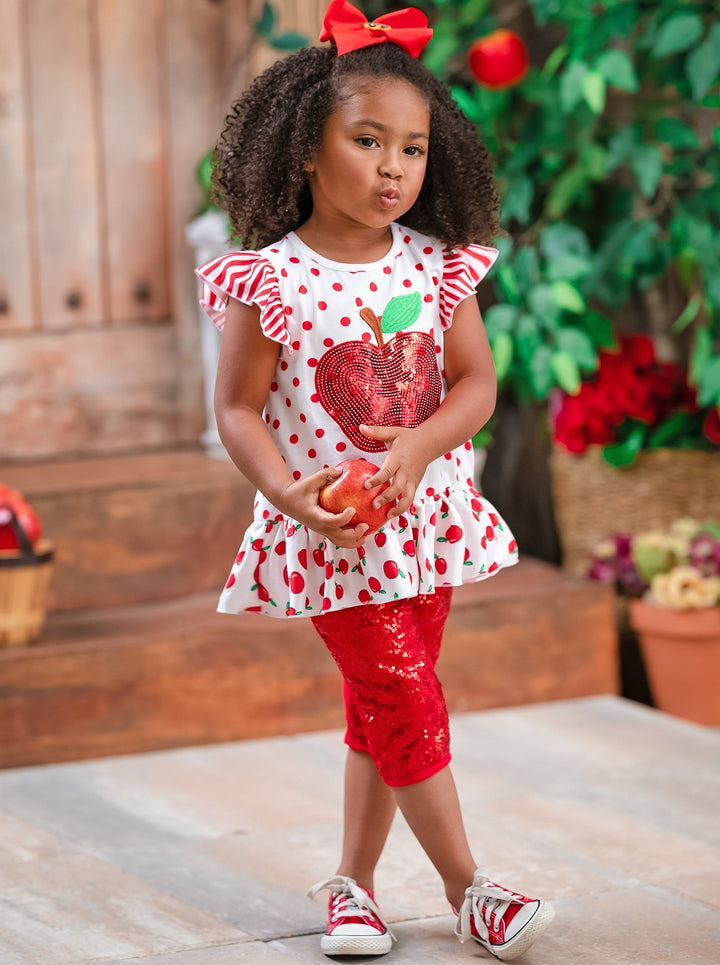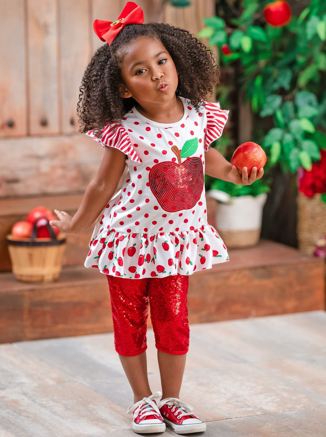 Flutter sleeve polka dot tunic with sequin apple applique, apple print ruffle hem, and sequin mesh leggings
