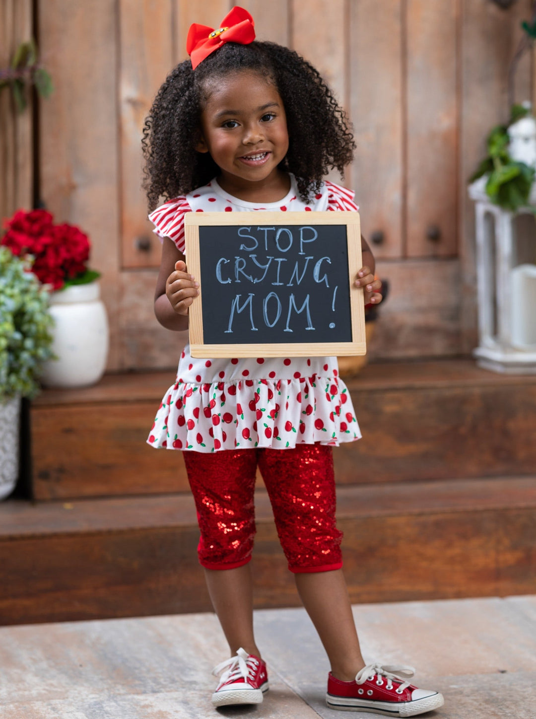 Get on your teacher's good side by showing off this sparkly legging set. Covered in dazzling sequin mesh applique, both the top and bottoms are fun and festive for the Back To School season.