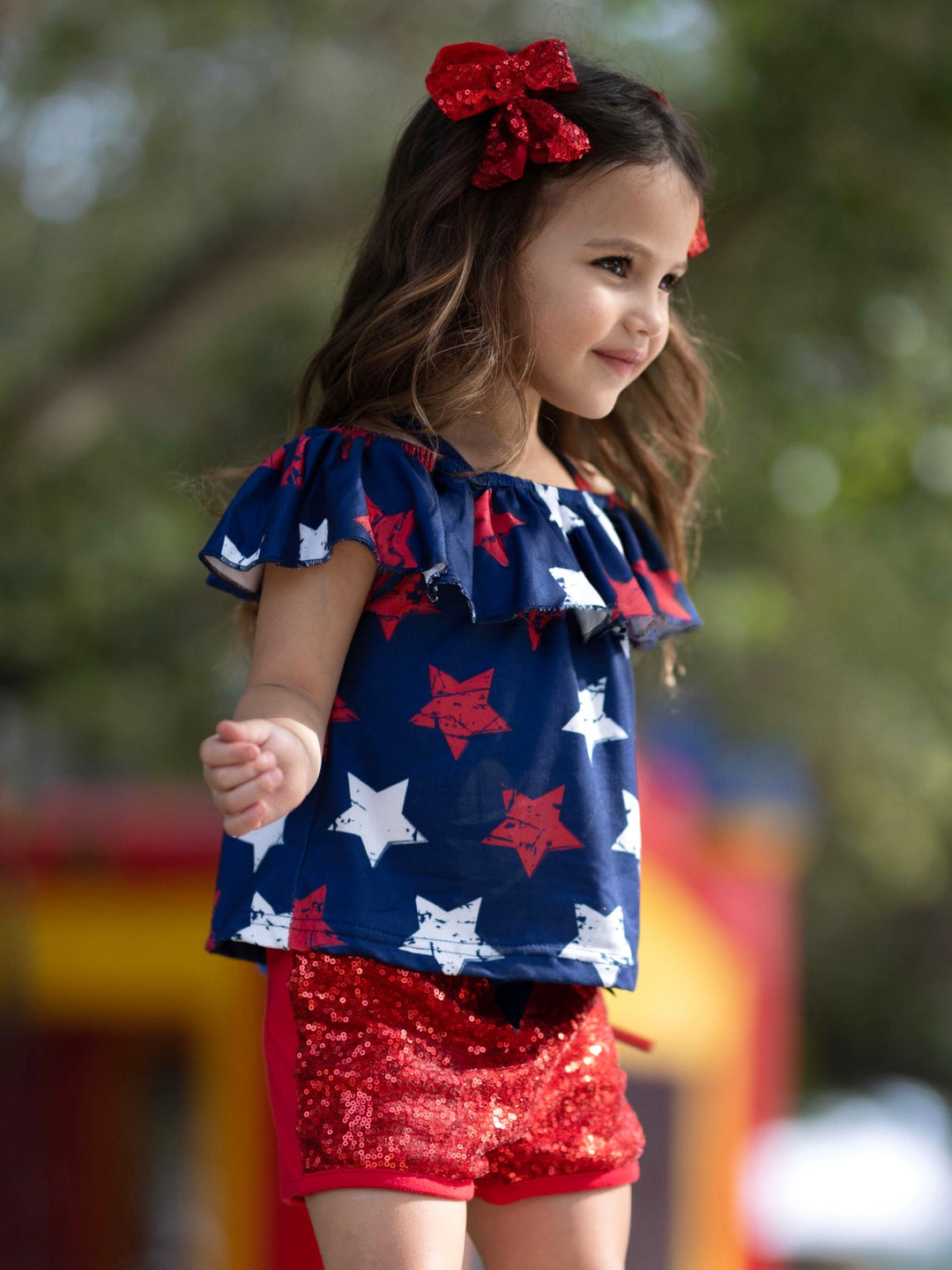 • This cold-shoulder top and sequin short set makes patriotic princesses dazzle brightly. Everyone will love the way your little girl sparkles and shimmers with every step as she plays the day away. Cue the compliments!