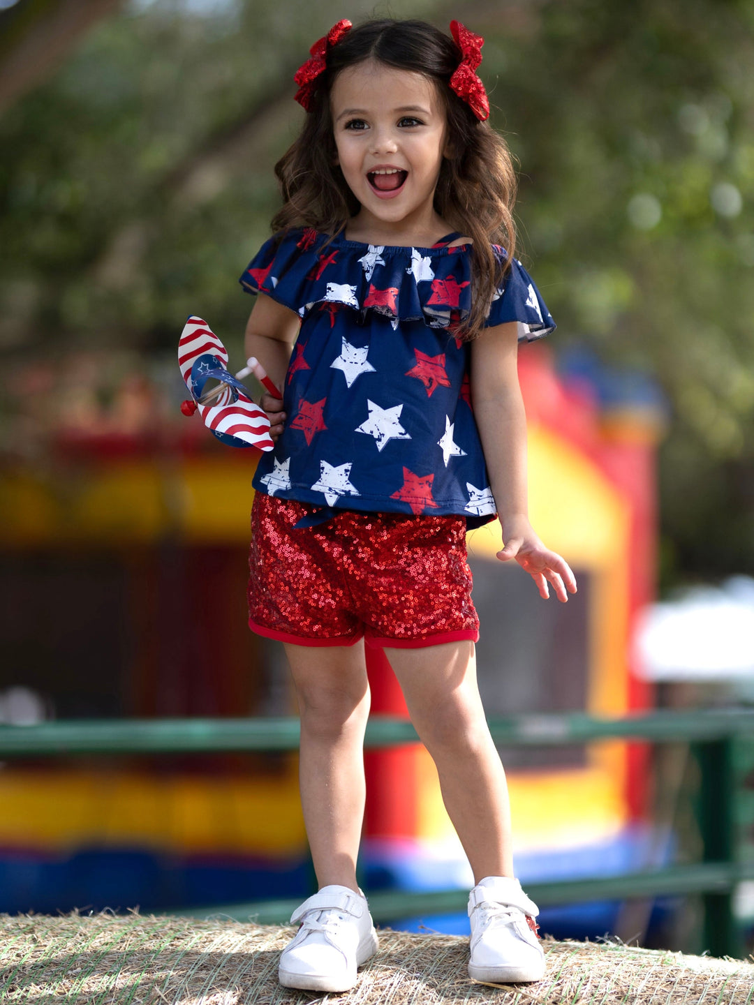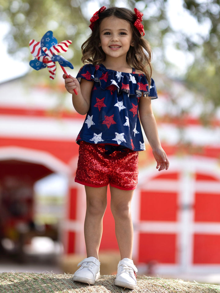 Girls Star Ruffle Bib Top And Sequin Shorts Set | 4th of July