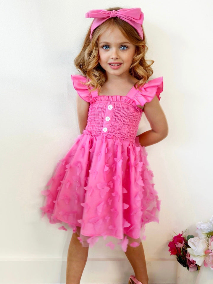 • Pink smocked bodice dress with flutter shoulder, tulle skirt overlay with butterfly appliqués