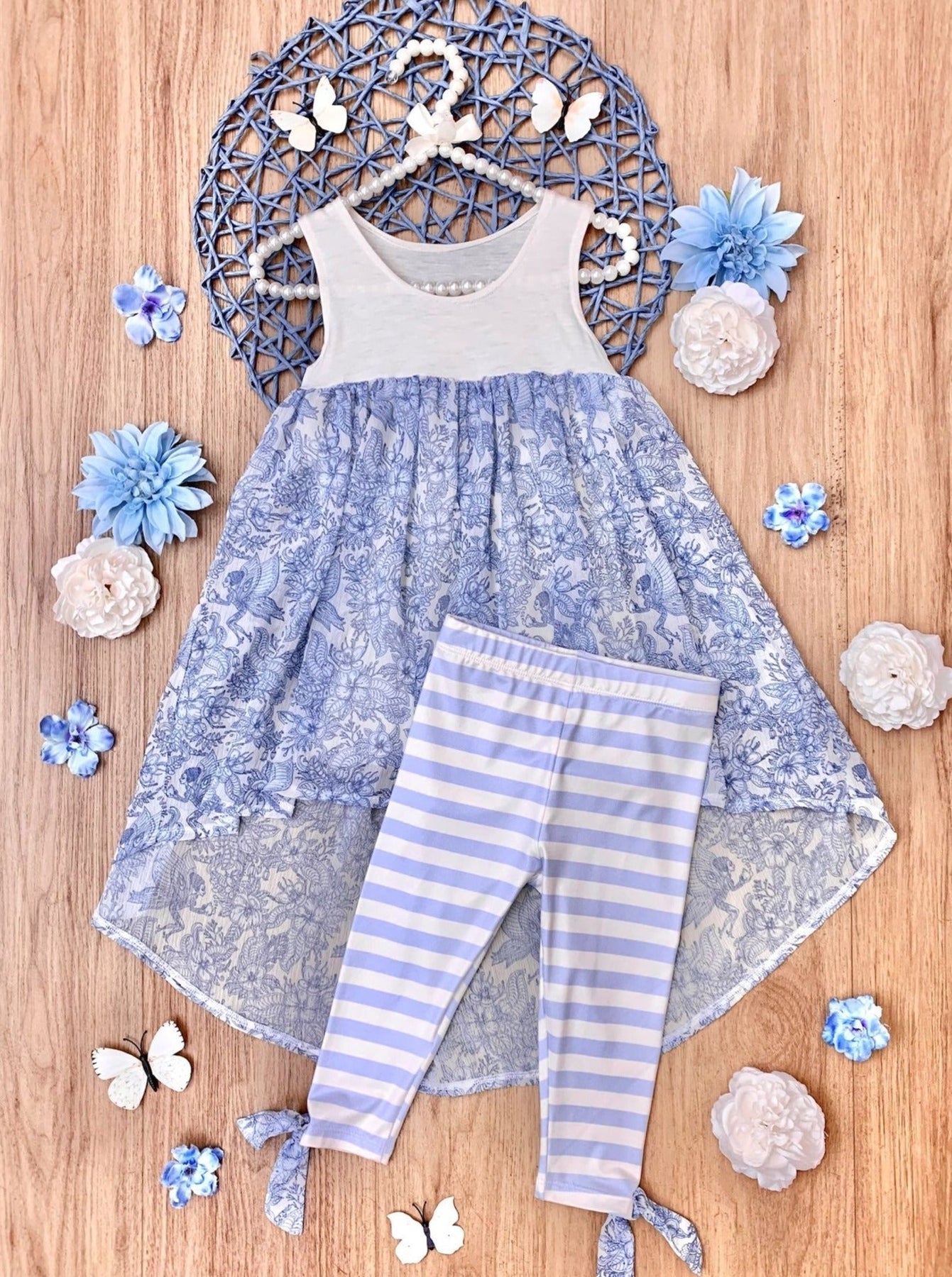 • Set includes sleeveless hi-lo tunic with floral print and blue-and-white striped leggings
