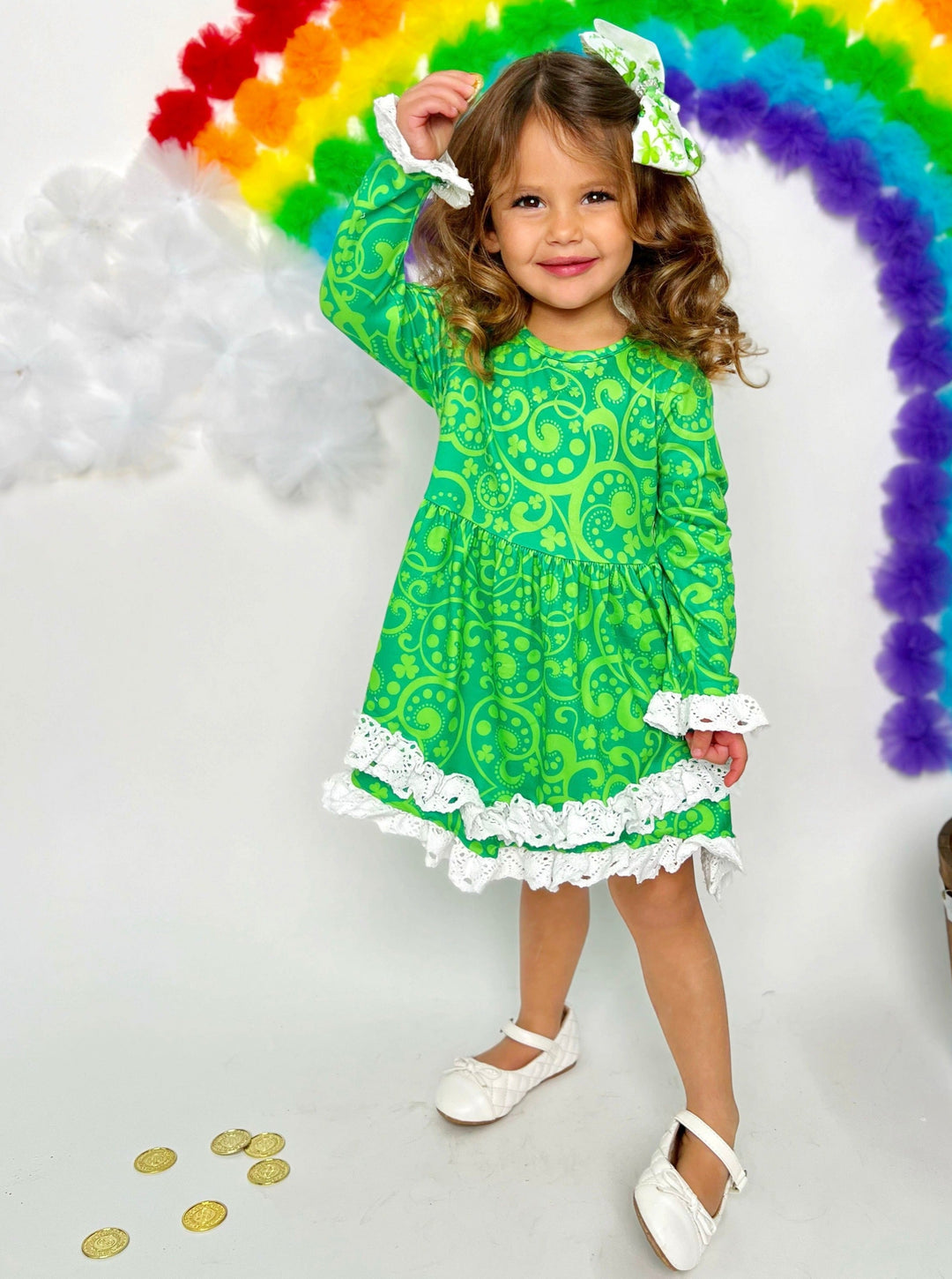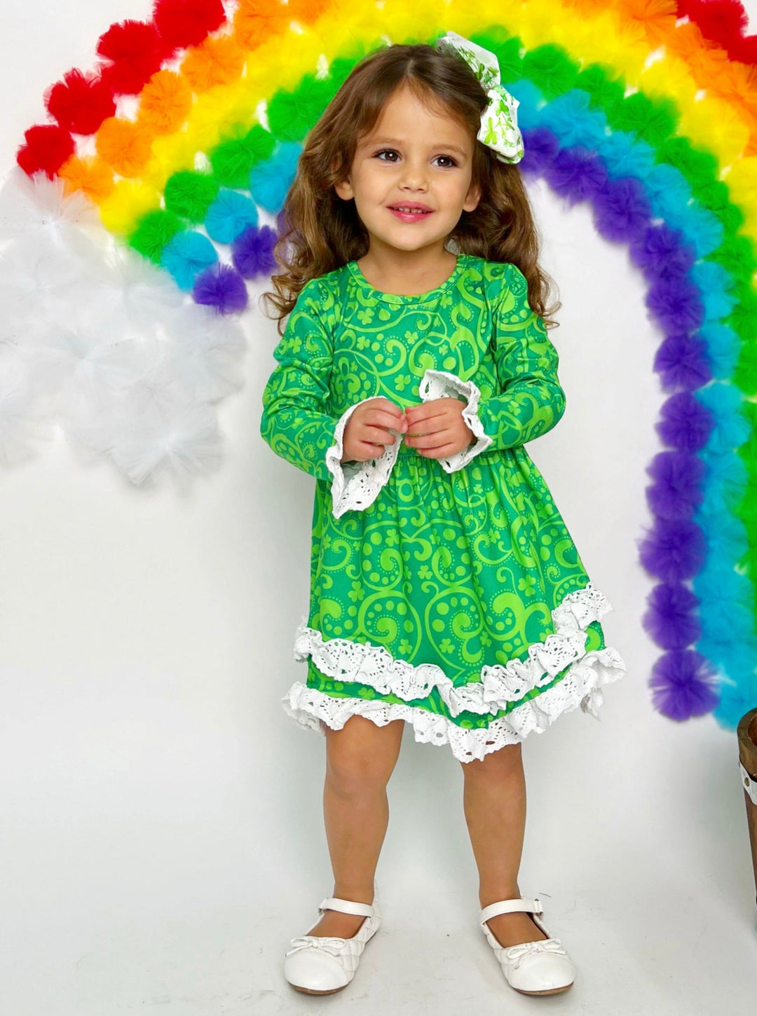 • We’re sure that this clover paisley print crochet hem dress will be her lucky charm this spring! This bright and cheery piece will layer her in soft fabric for a comfortable and festive look to celebrate St. Patrick’s day!
