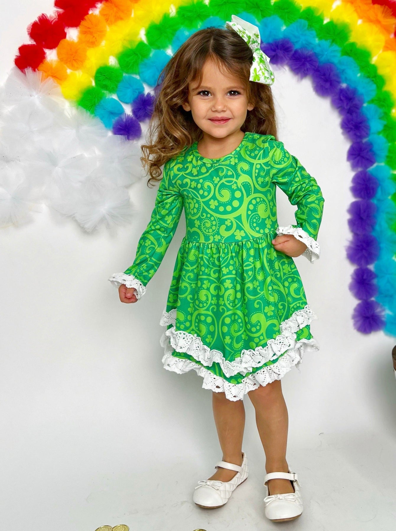 Girls St. Patricks Day Paisley Flared Sleeve Crochet 2-Tier Dress - Green / 2T - Girls St. Patricks Dress