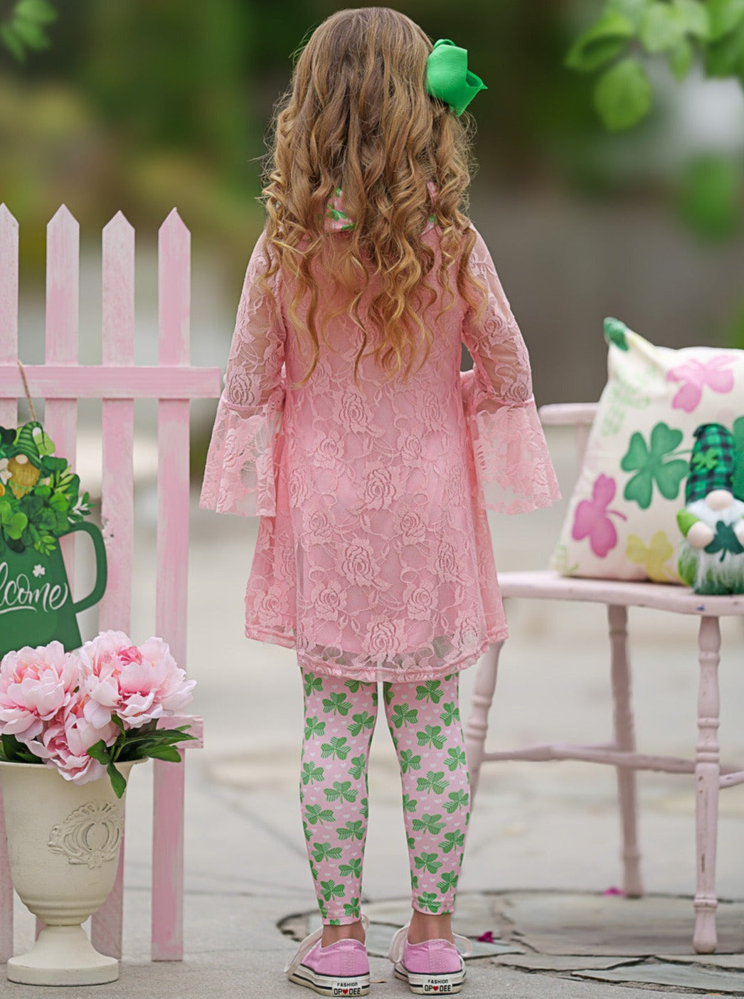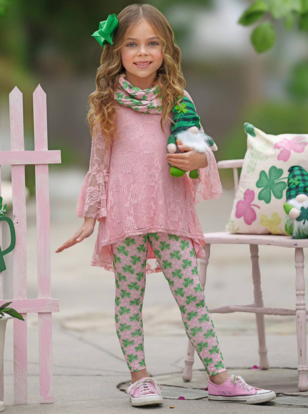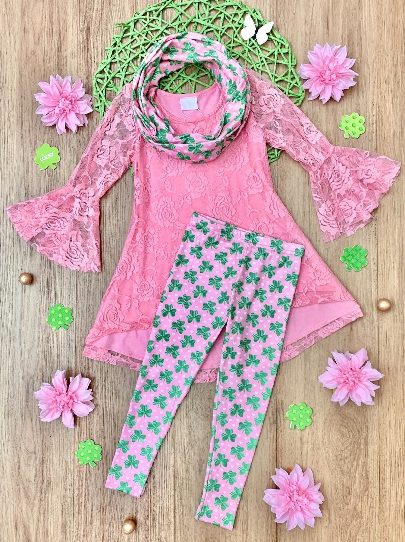 Set includes pink hi-lo lace tunic with wide ruffle cuff details, clover print leggings, and matching clover print infinity wrap scarf