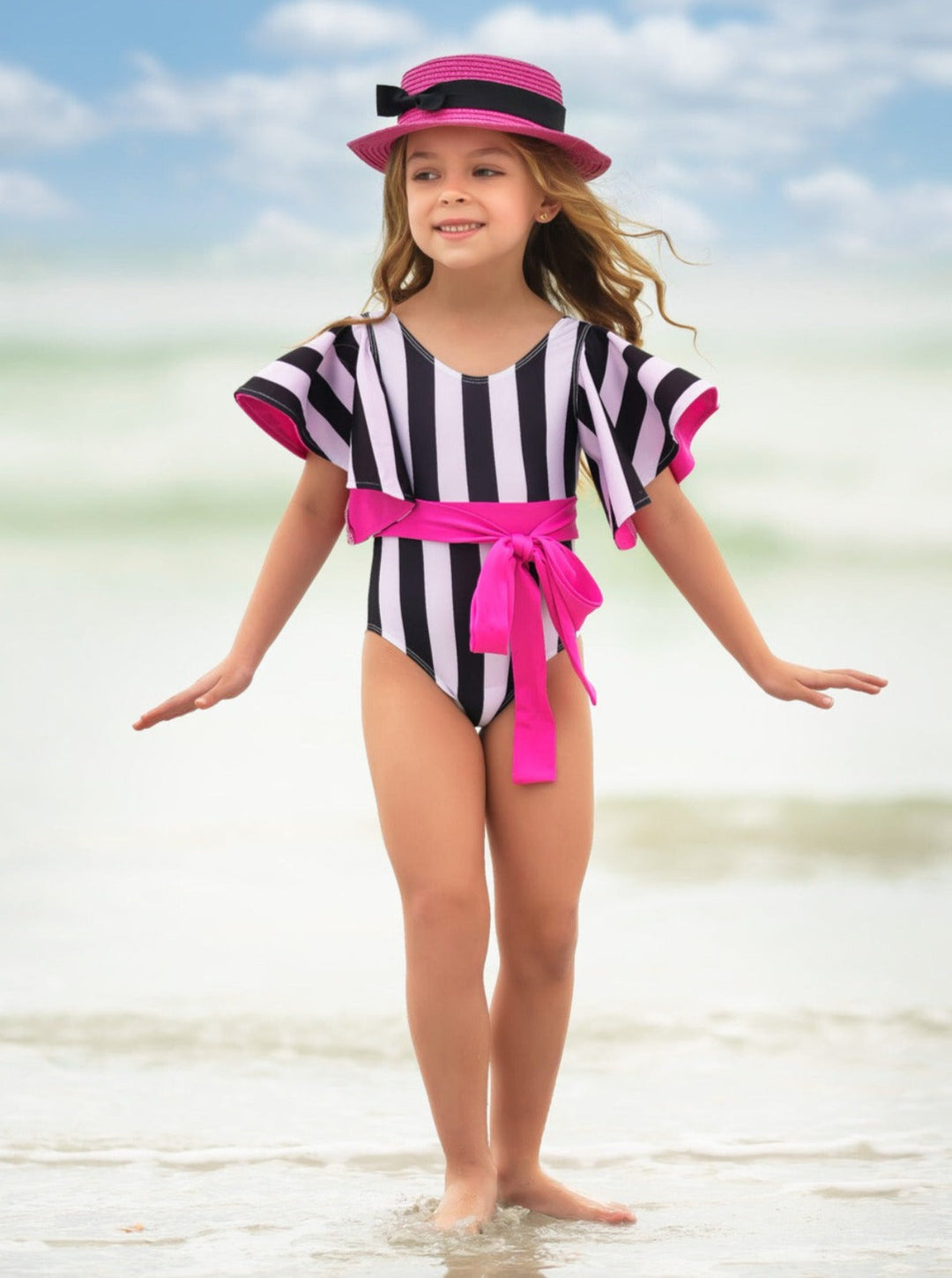 • Dressed to impress in swim-tastic attire thanks to our striped flare sleeve one-piece swimsuit. The pop of hot pink makes the black and white stripes and fancy sleeves stand out all the more. It's enough to make even mommy a little jealous!