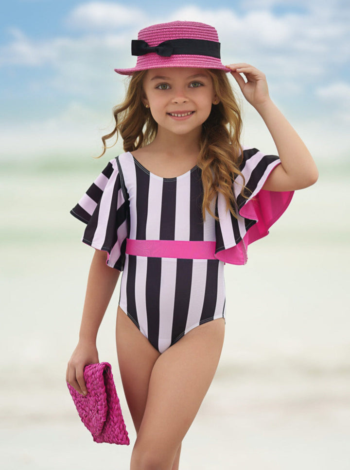 Mia Belle Girls Swimwear | Flare Sleeve Striped One Piece Swimsuit
