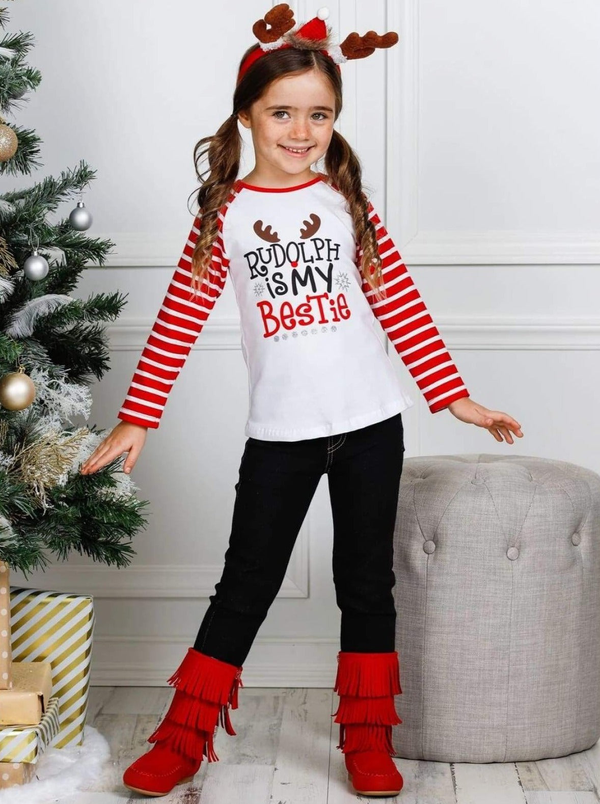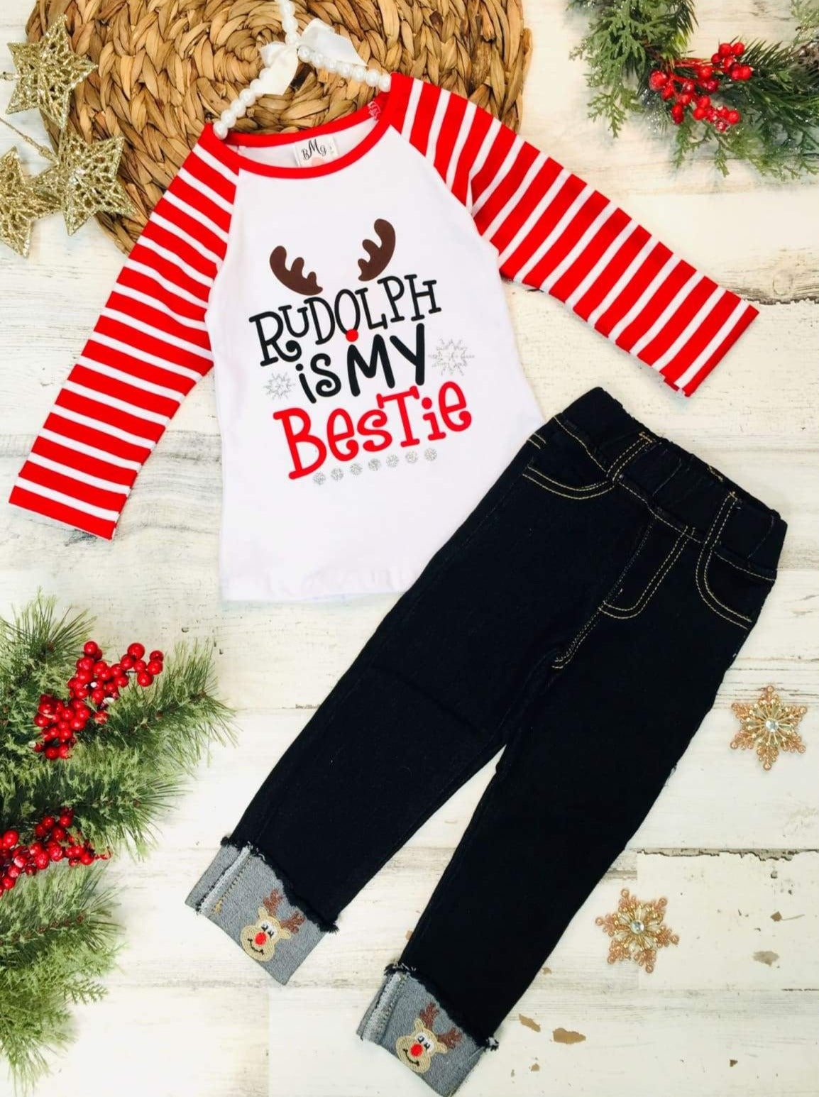 Who's YOUR bestie? If it happens to be a certain red-nose reindeer, then we've got the perfect top and cuffed jeans set for you! Fun, festive, and super cute, there's no place this outfit won't shine brightly!