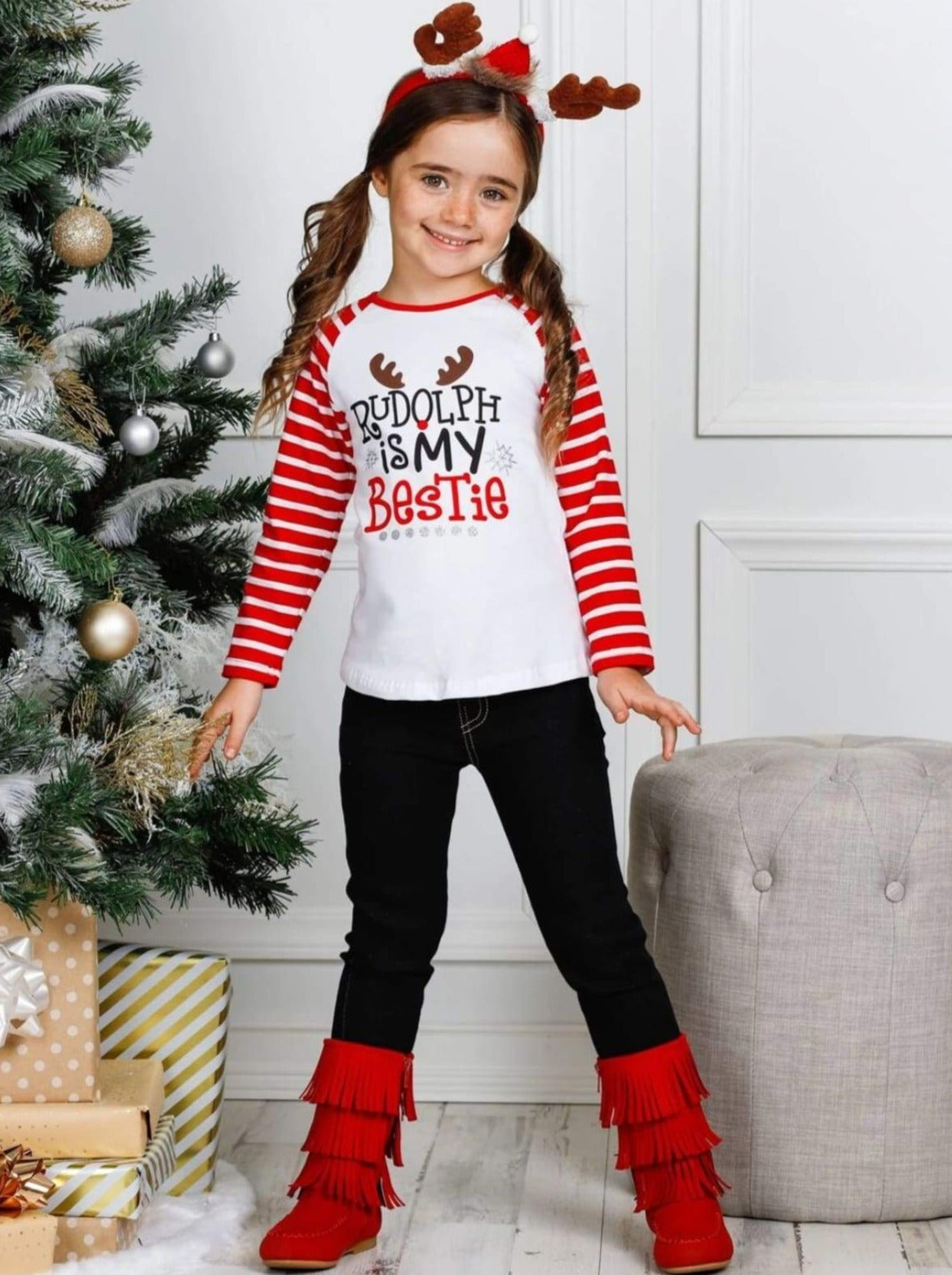 Long-sleeved raglan striped top with "Rudolph is My Bestie" graphic print and matching reindeer cuffed hem
