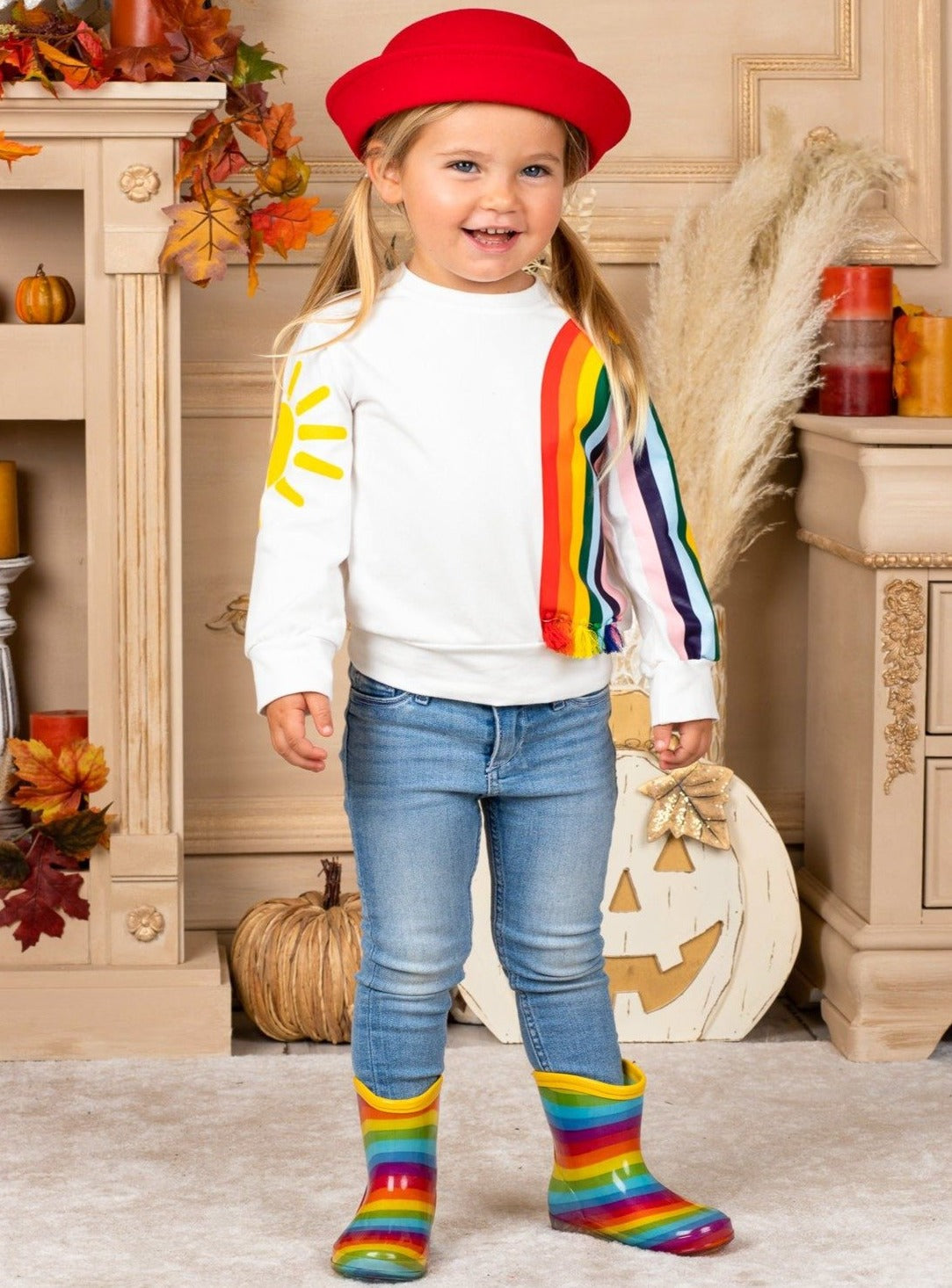 • Sweater features a sun graphic on the sleeve and a big bright rainbow half on the bodice and the other half on the sleeve.