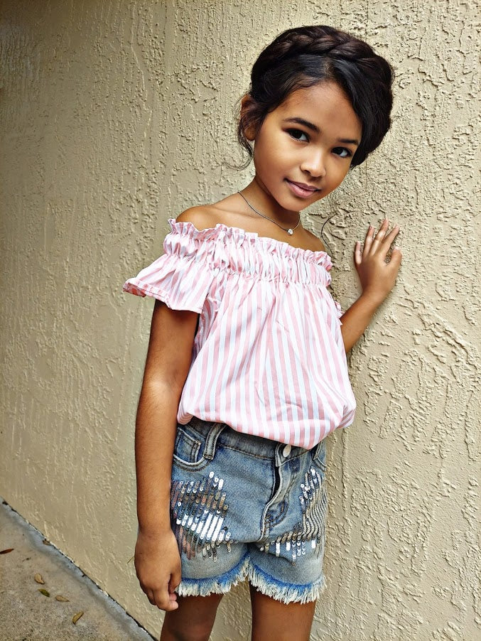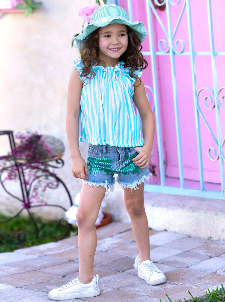 Strike a pose and get ready for compliments in this sparkly two-piece sequin denim short set. What's not to love about the striped top with a high ruffle collar and cap sleeves? Too cute!