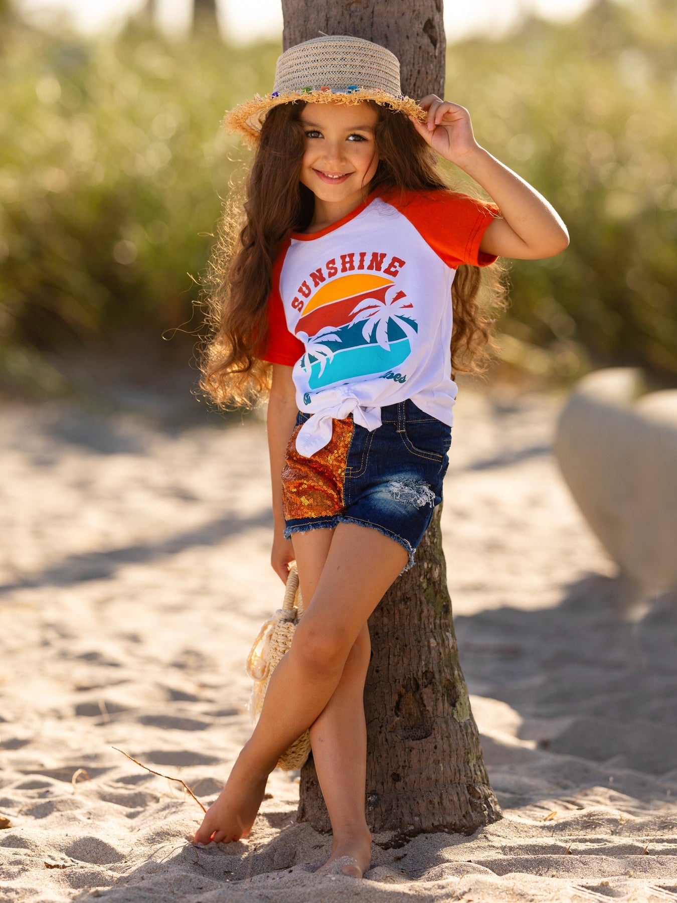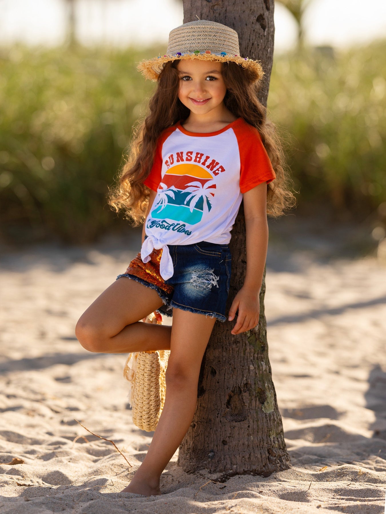 • Short raglan-sleeved knot-hem top with a "Sunshine & Good Vibes" graphic and sequin patch denim shorts