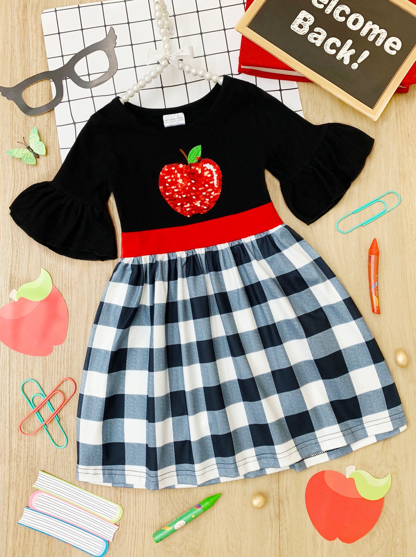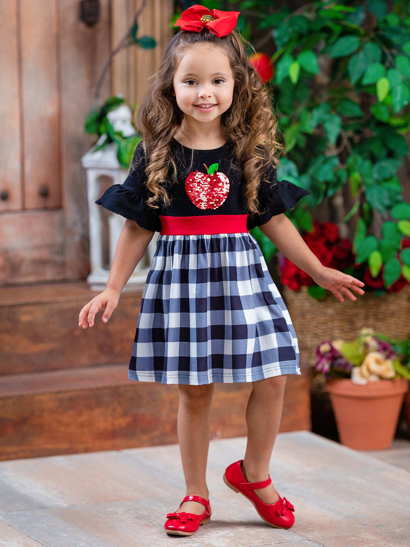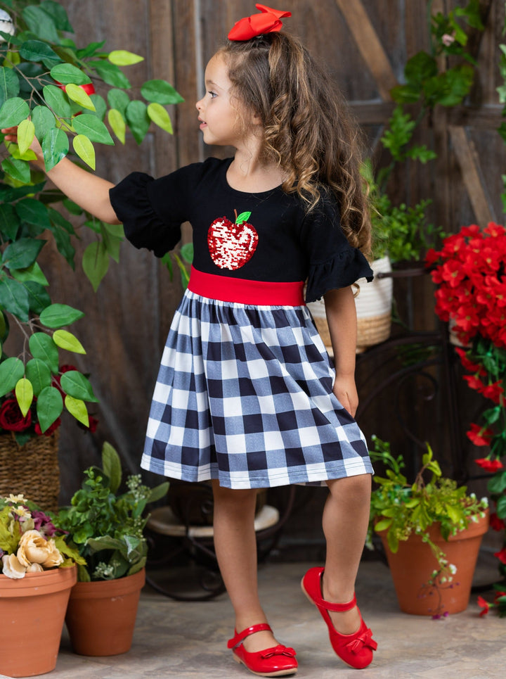 Ruffle sleeve A-line dress with sequin apple applique bodice, red waistband, and plaid skirt