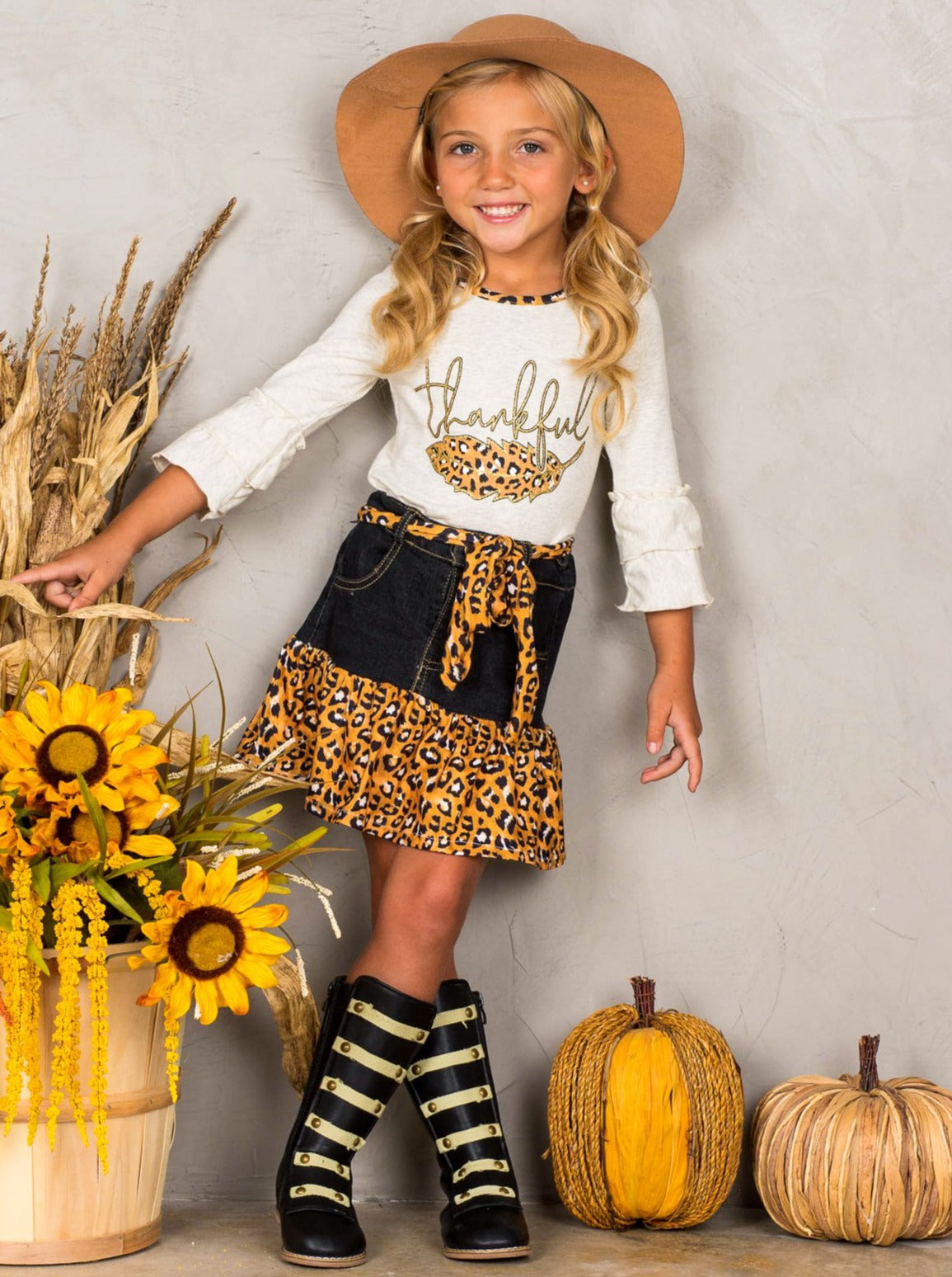 - We're so thankful for sweet Fall denim skirt sets perfect for your Autumn time princess. Stylish, lightweight, and covered in trendy leopard print patterns, she'll love the ruffles on the long sleeve cuffs and the base of the denim skirt.