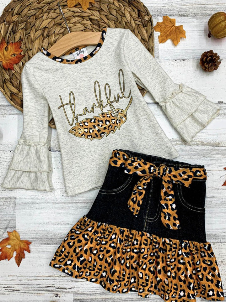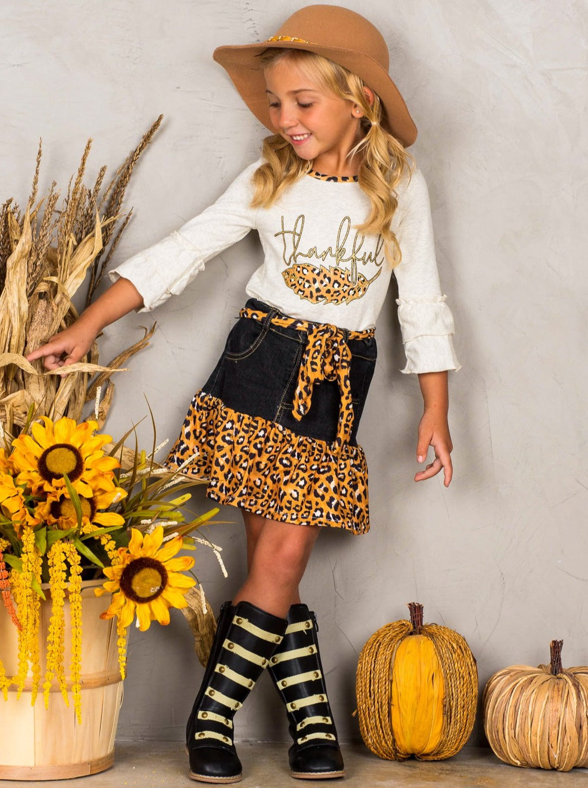 - Long-sleeve "Thankful" top graphic and a leopard ruffled skirt with matching sash belt