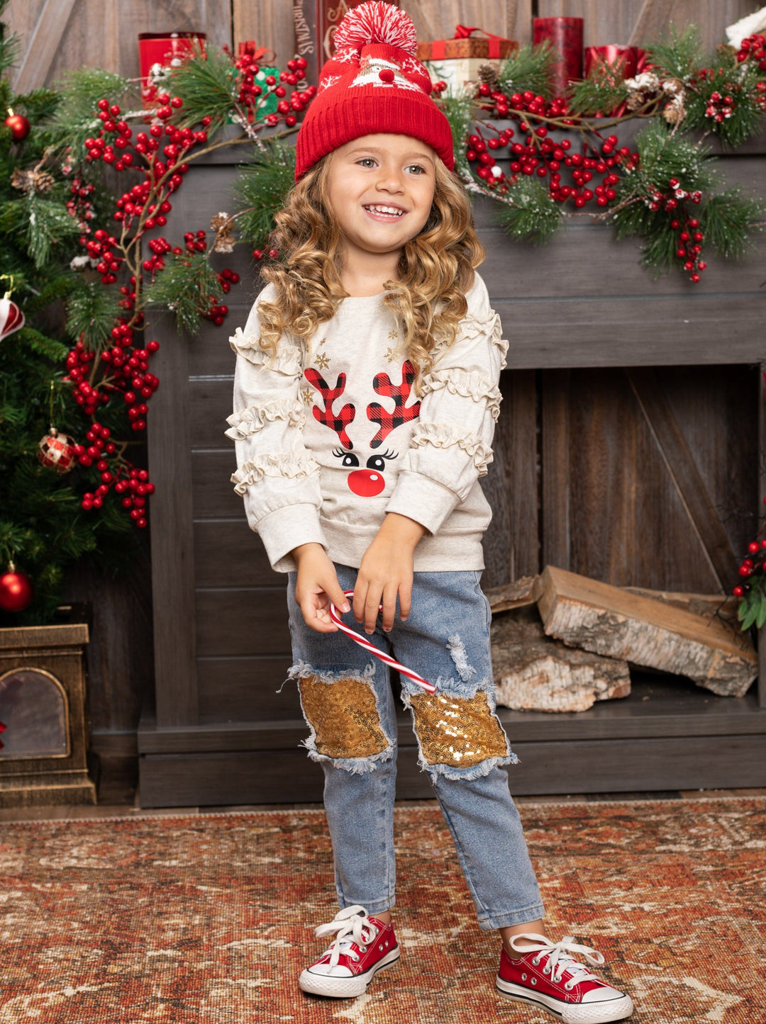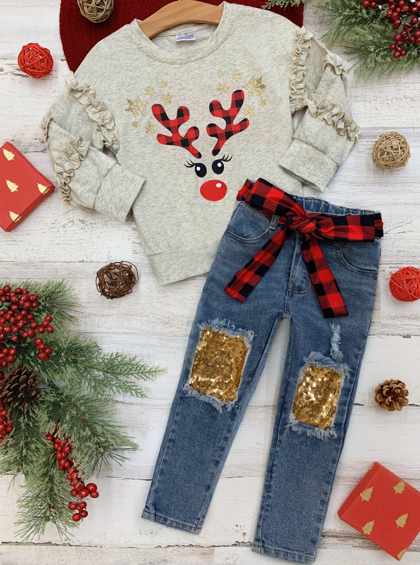 - Long-sleeved sweatshirt with ruffle accents, plaid reindeer print, and gold sequin patched jeans with a plaid belt sash