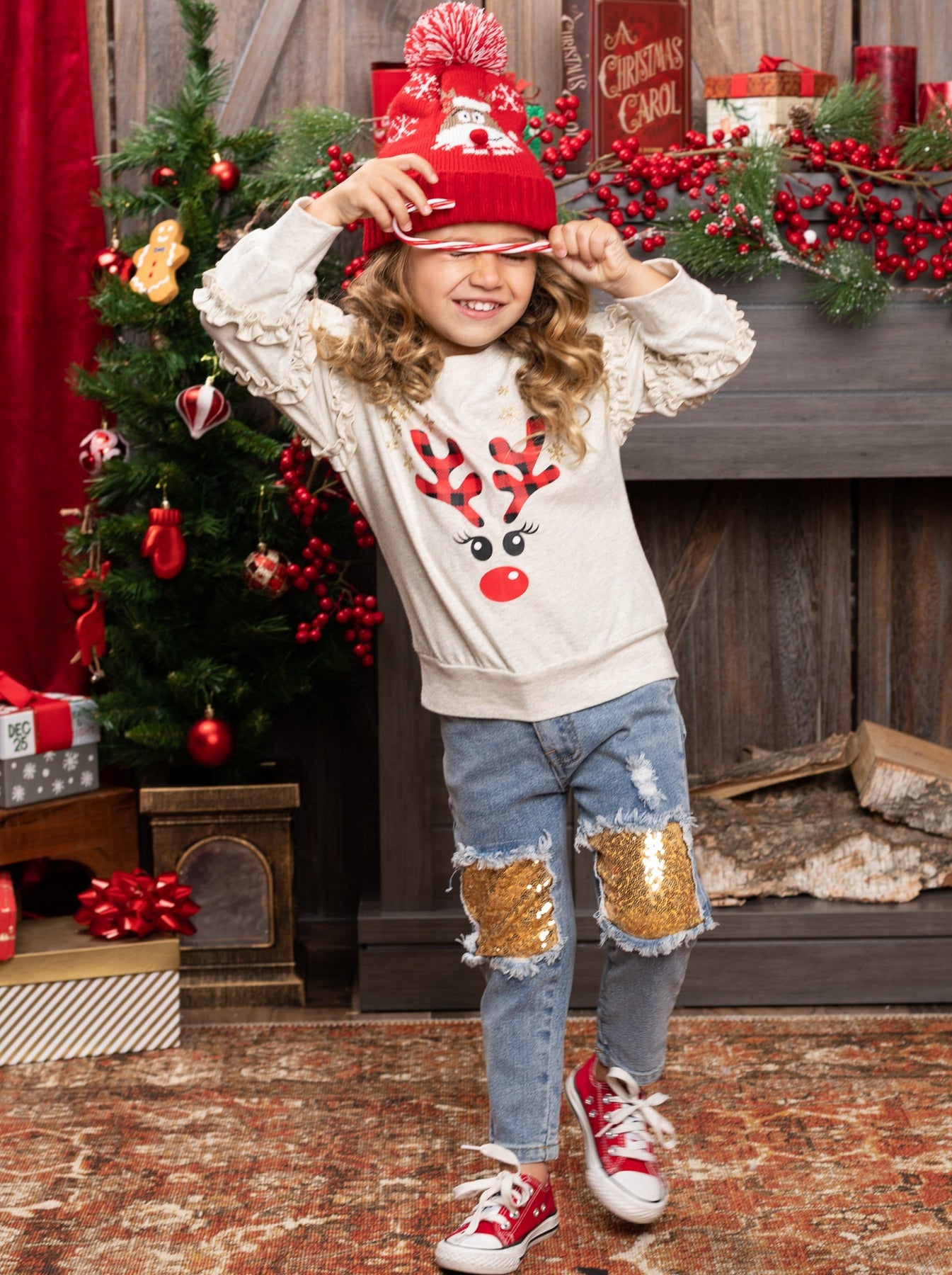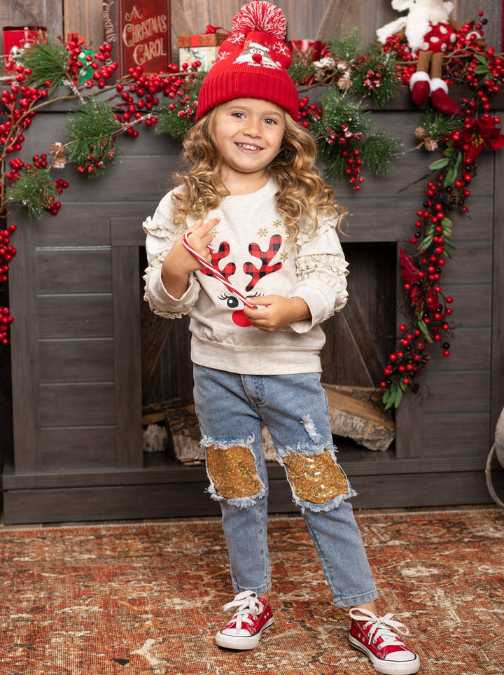 Oh, Deer Ruffle Sweatshirt and Sequin Patched Jeans Set