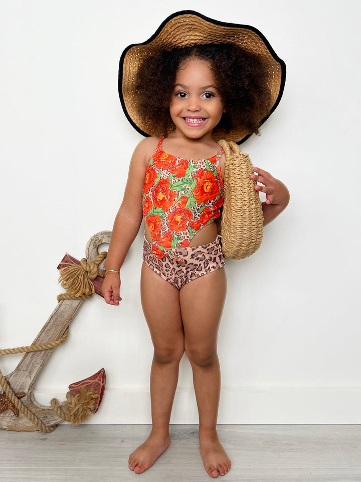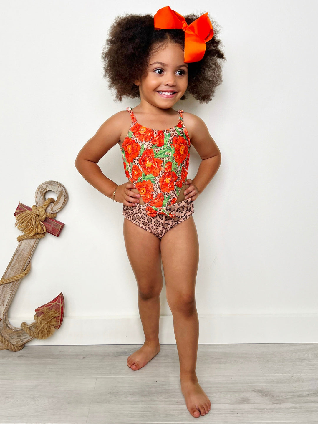 Your sweet summer child deserves a wild one-piece swimsuit to match her innovative sense of style. Check out this open-side front tie, high-waisted design covered in wildflowers and leopard print. Talk about a unique look you won't find anywhere else. Keep your little girl leading the pack in swimwear fashion
