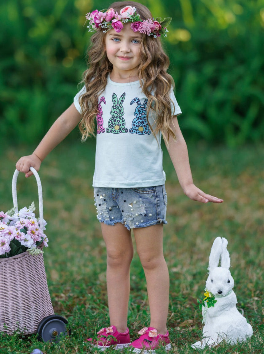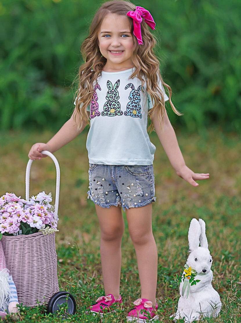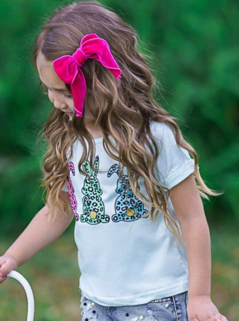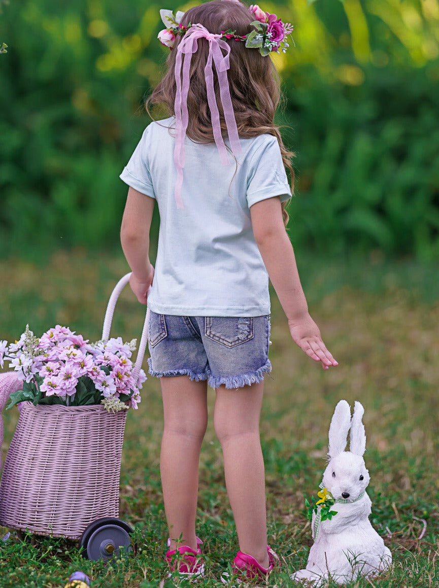 Let rabbits, and your little girl, run wild this Spring with this chic knot hem graphic tee perfect for casual Easter activities. The mint short-sleeved top will look incredible with her favorite skirt, shorts, leggings, or jeans. She'll be dressed in her bunny best from her classroom party to egg hunting with the family.