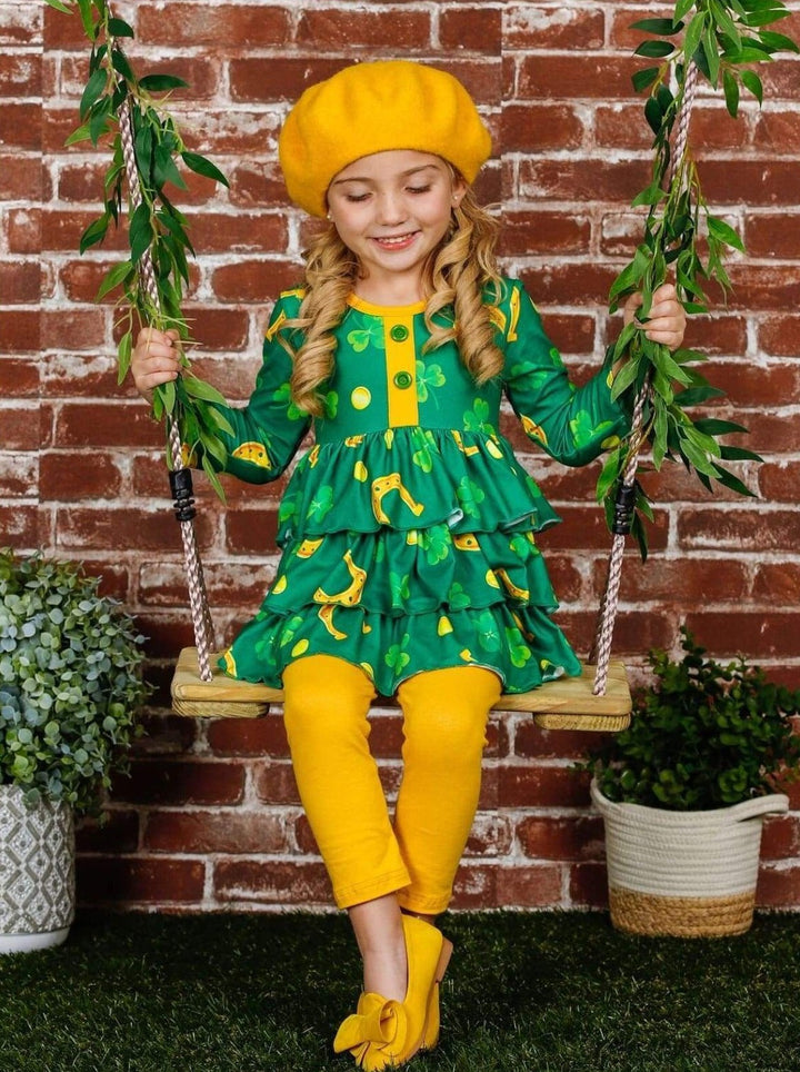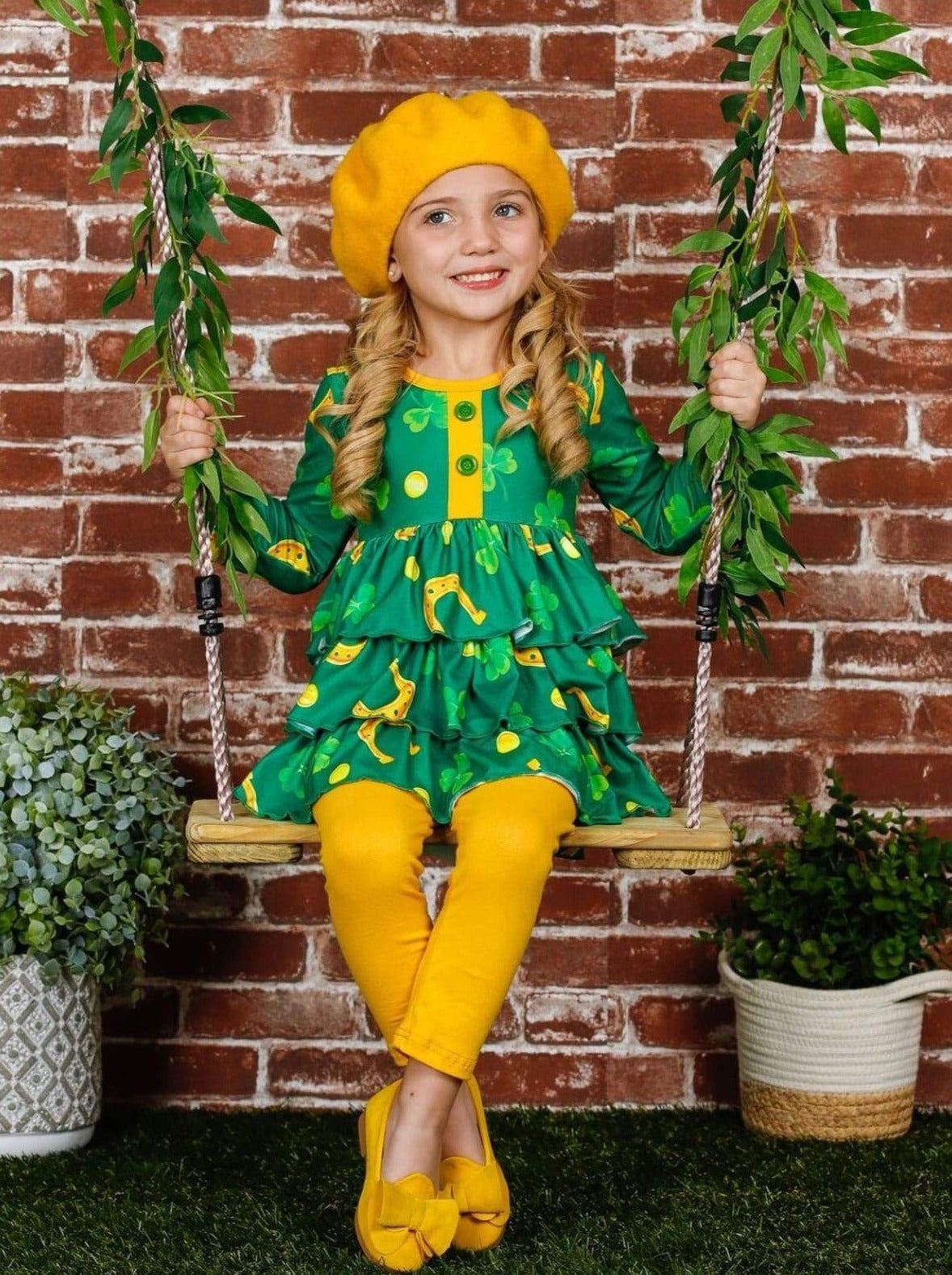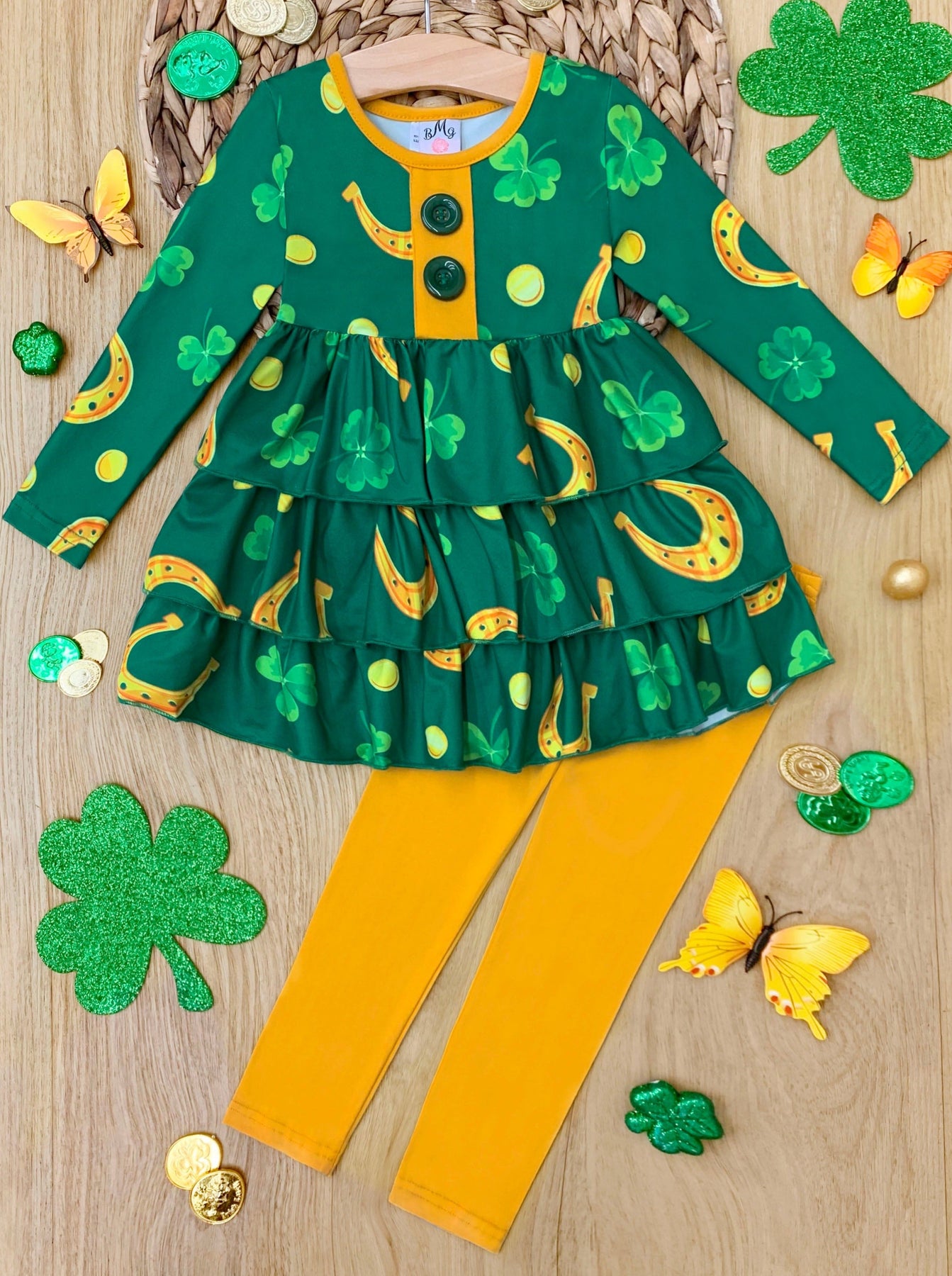 - Irish eyes will surely smile when wee lasses don this sweet legging set. Boasting a green, three-tiered ruffle top with horseshoes, gold coins, and clover details, its cottony construction and stretchy leggings will keep her cozy from the top o' the morning and through an imaginative day of play.
