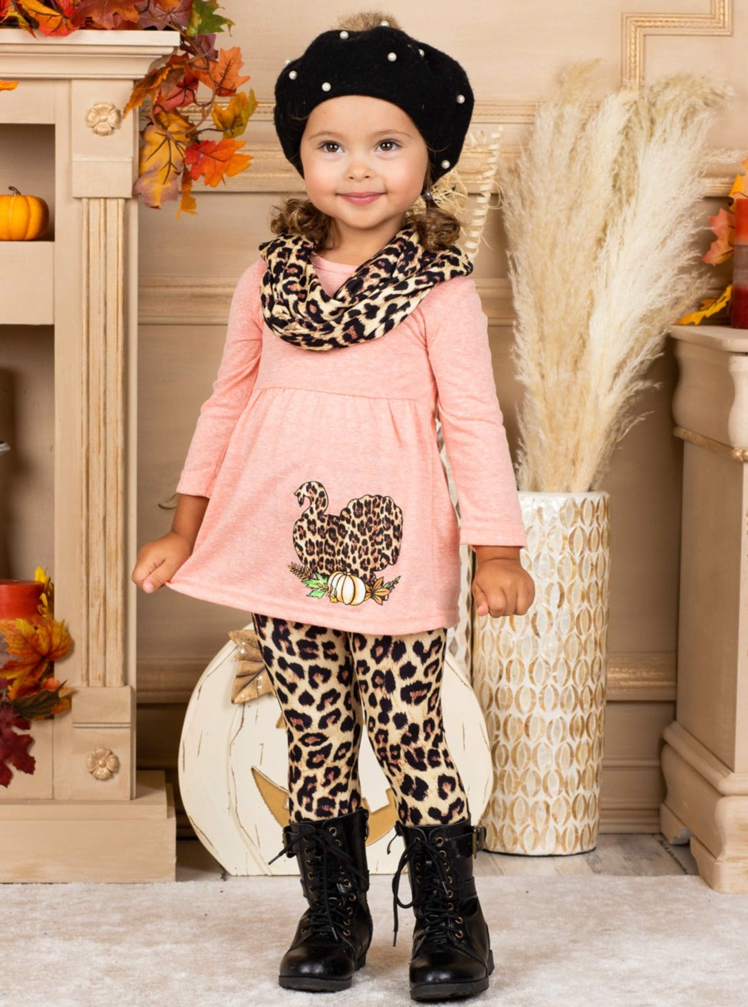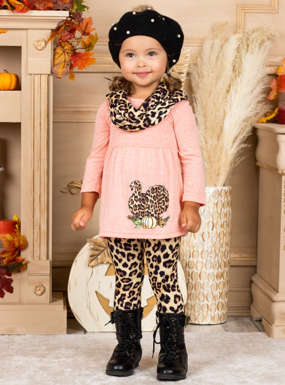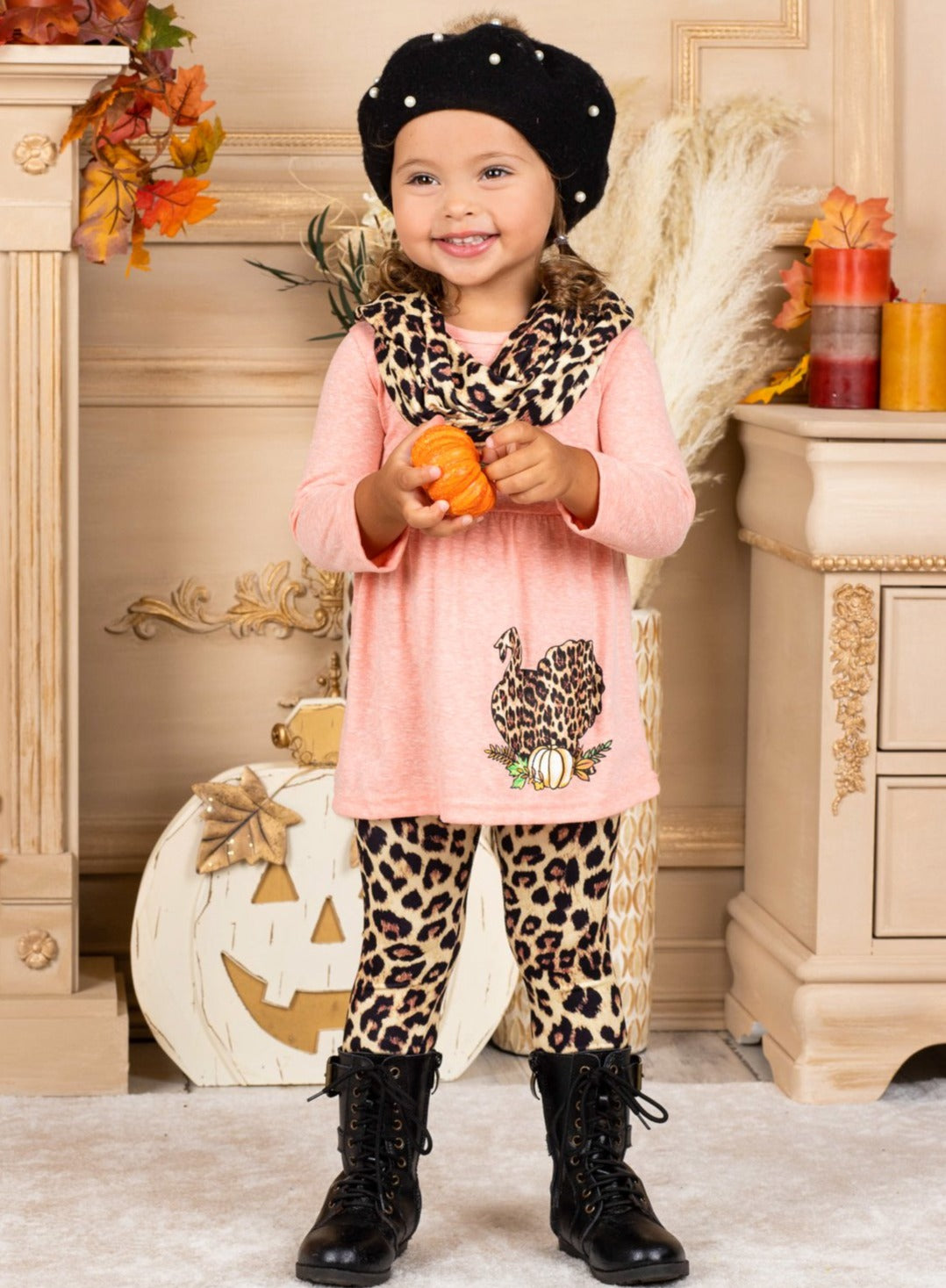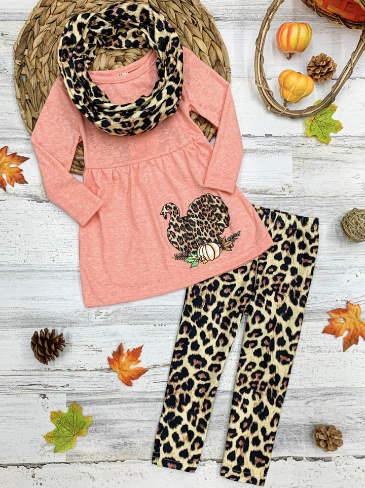 When it comes to fall fashion, even the turkeys are wild! Love the way your little girl looks this Turkey Day season wearing our turkey tunic, leopard legging, and scarf set.