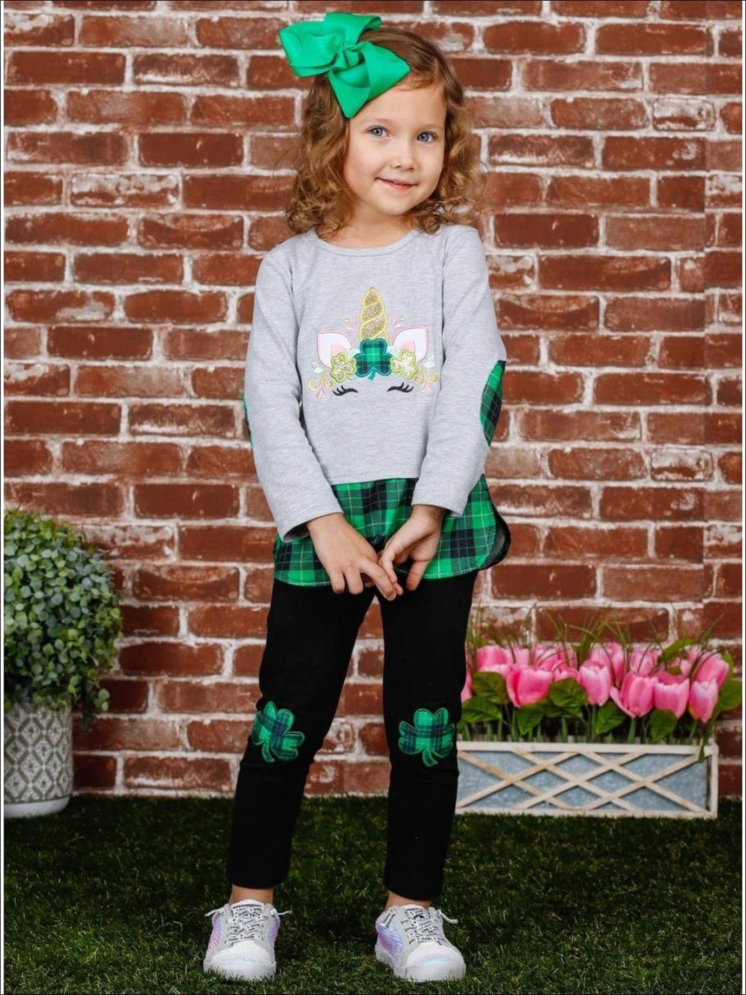 Tunic features a unicorn applique with a glittered/plaid horn and clovers and plaid elbow patches and hem; leggings feature plaid clover patches