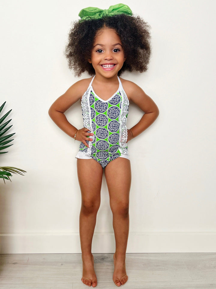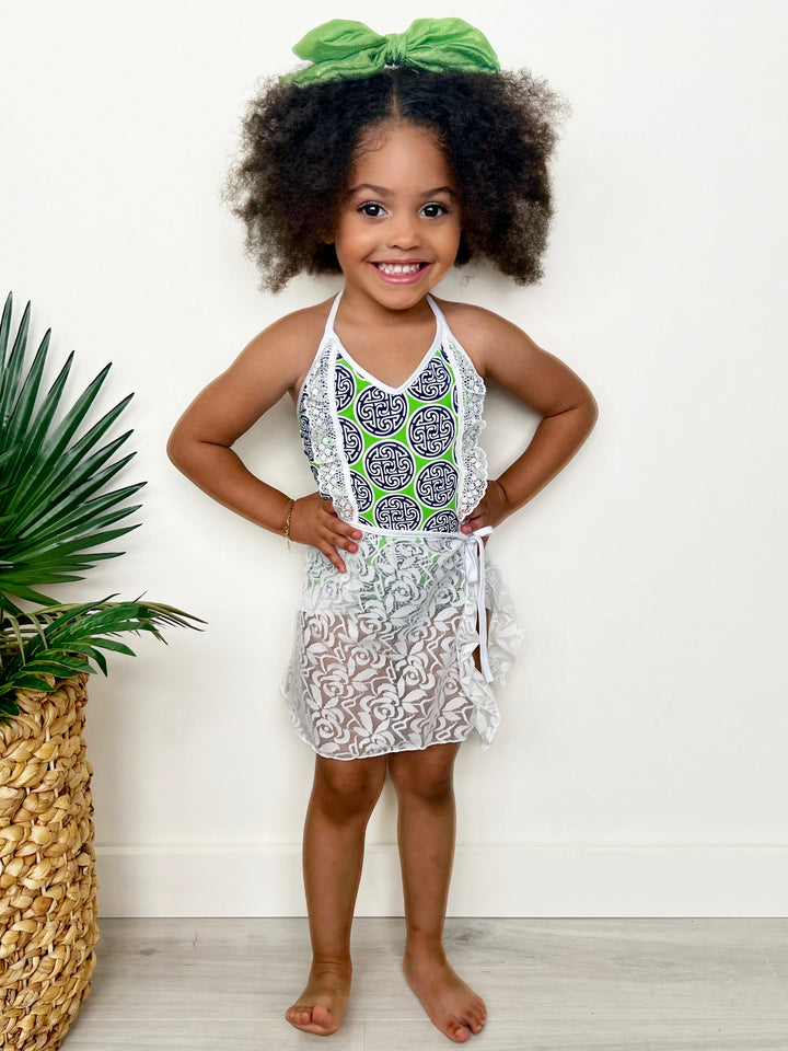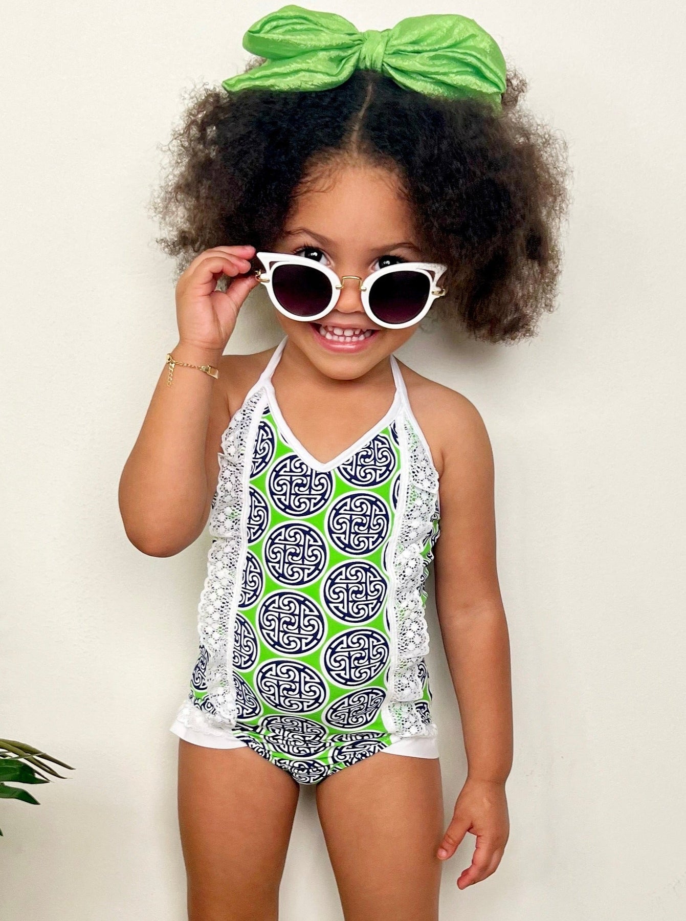 One Piece Girls Swimsuit | Medallion Print Lace Ruffled Swimsuit