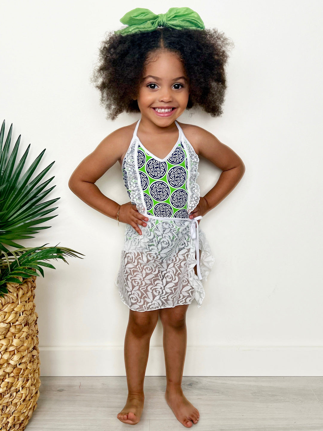 • Your little beach cutie can splash the day away in style with this abstract, lacey, and trend-right one-piece swimsuit. Dainty, stretchy, and with a unique back tie design, everyone will be asking where you found it!
