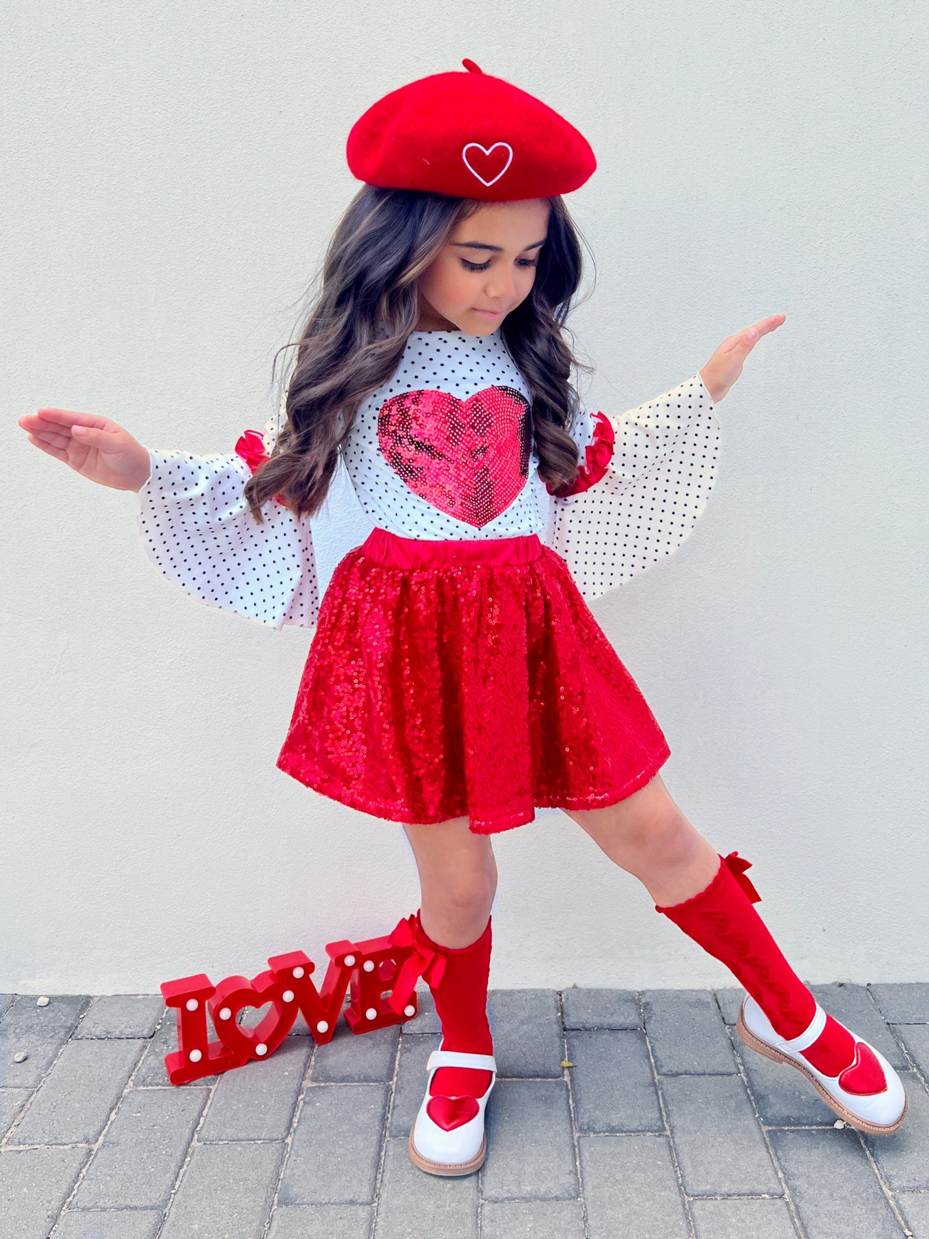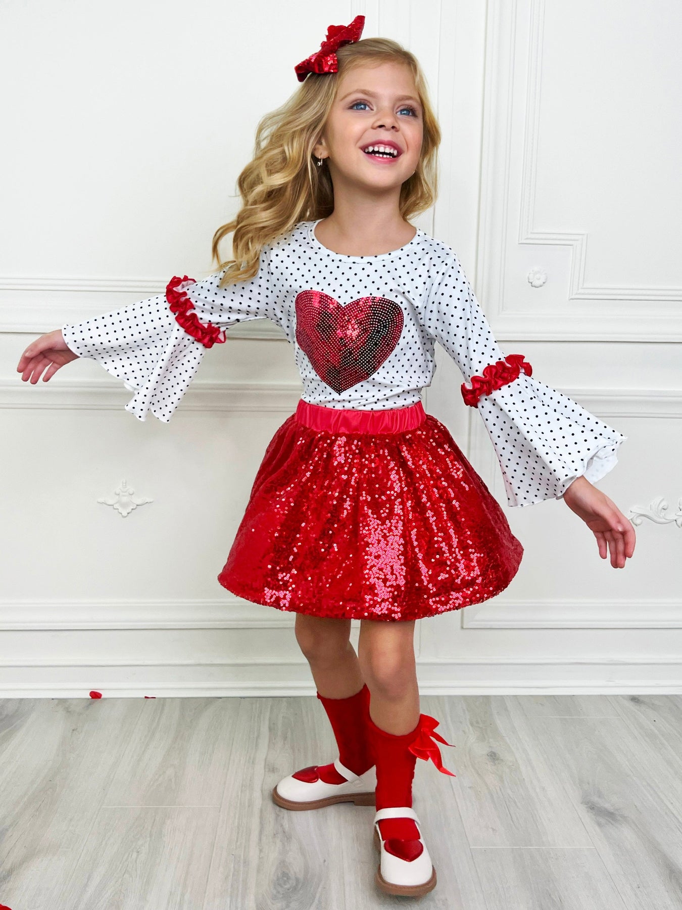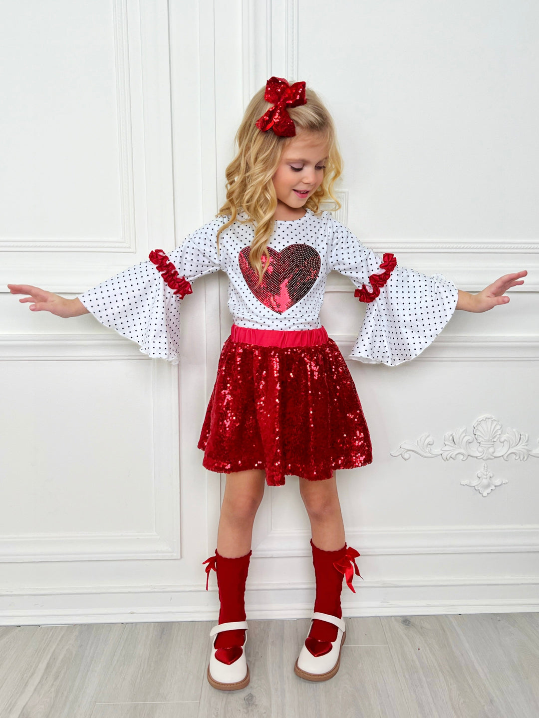 Set includes a polka-dotted top with flared cuffs, a sequined red heart in the center, and a red sequined skirt with an elastic waistband