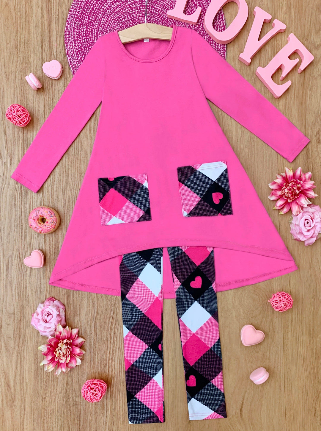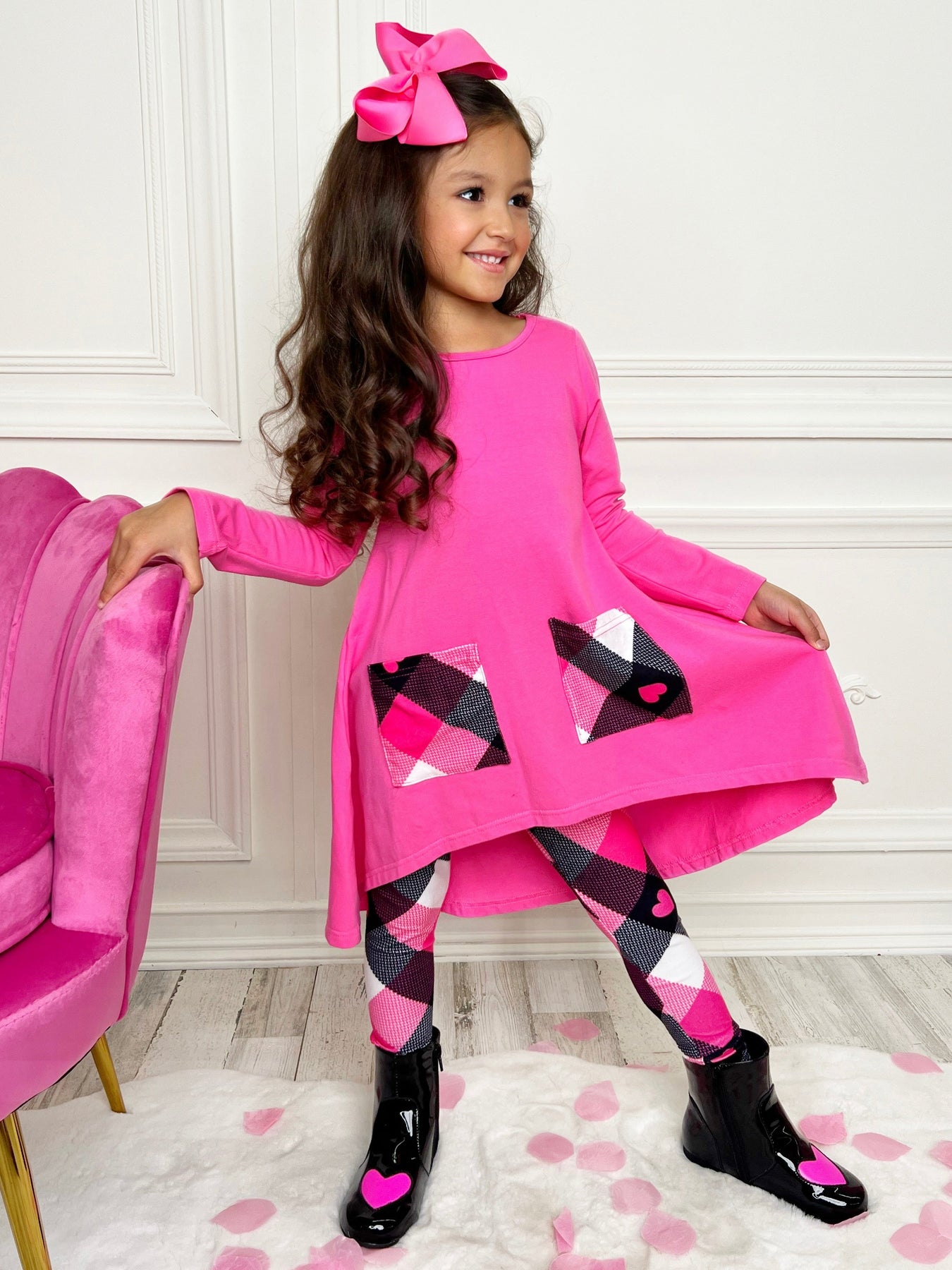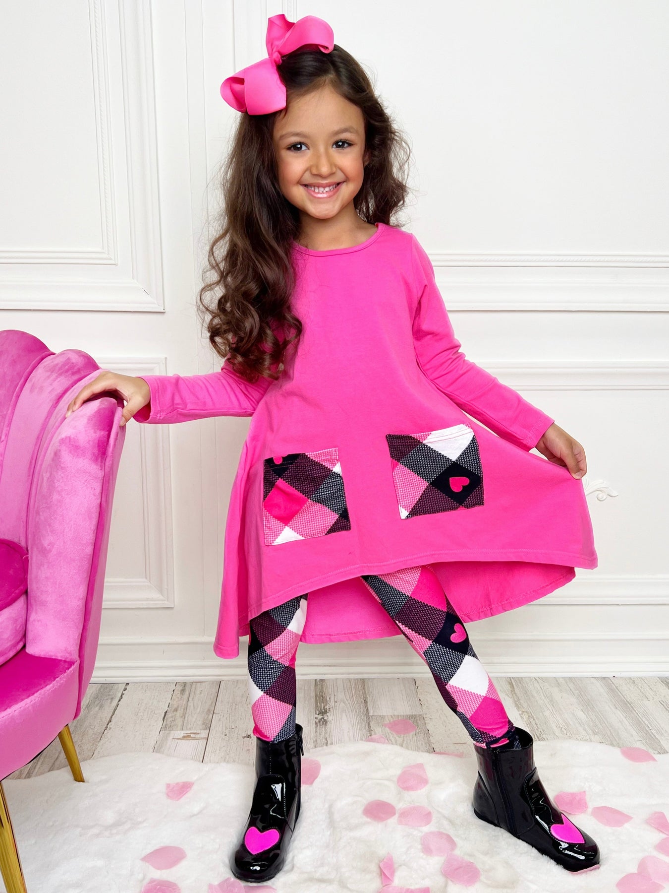 It's all LOVE and pink plaid with our pretty legging set. Designed to make her wardrobe extra sweet and charming, this hi-lo tunic with pockets to match the stretch leggings wins hearts with its adorable color mix and cute style.