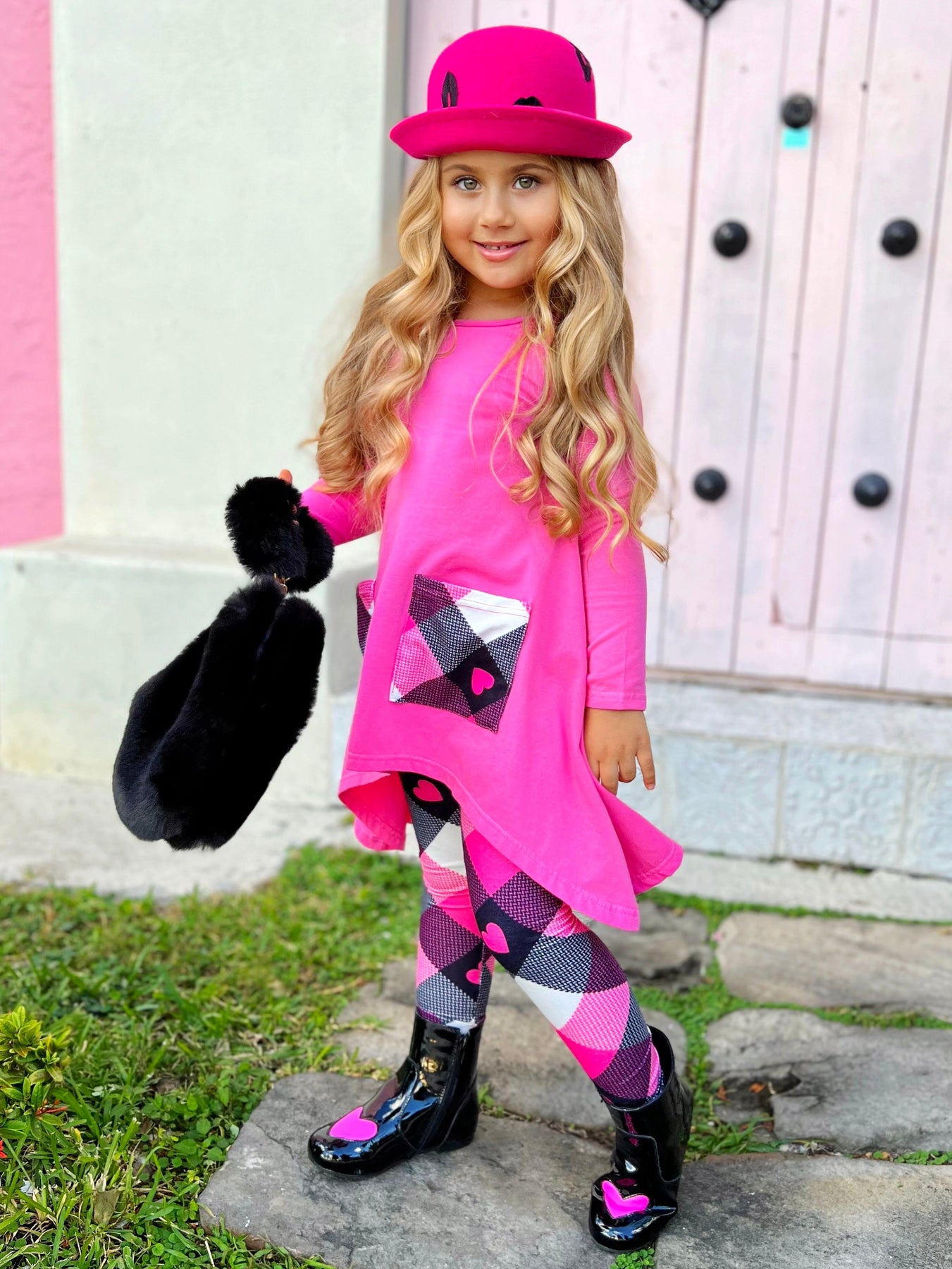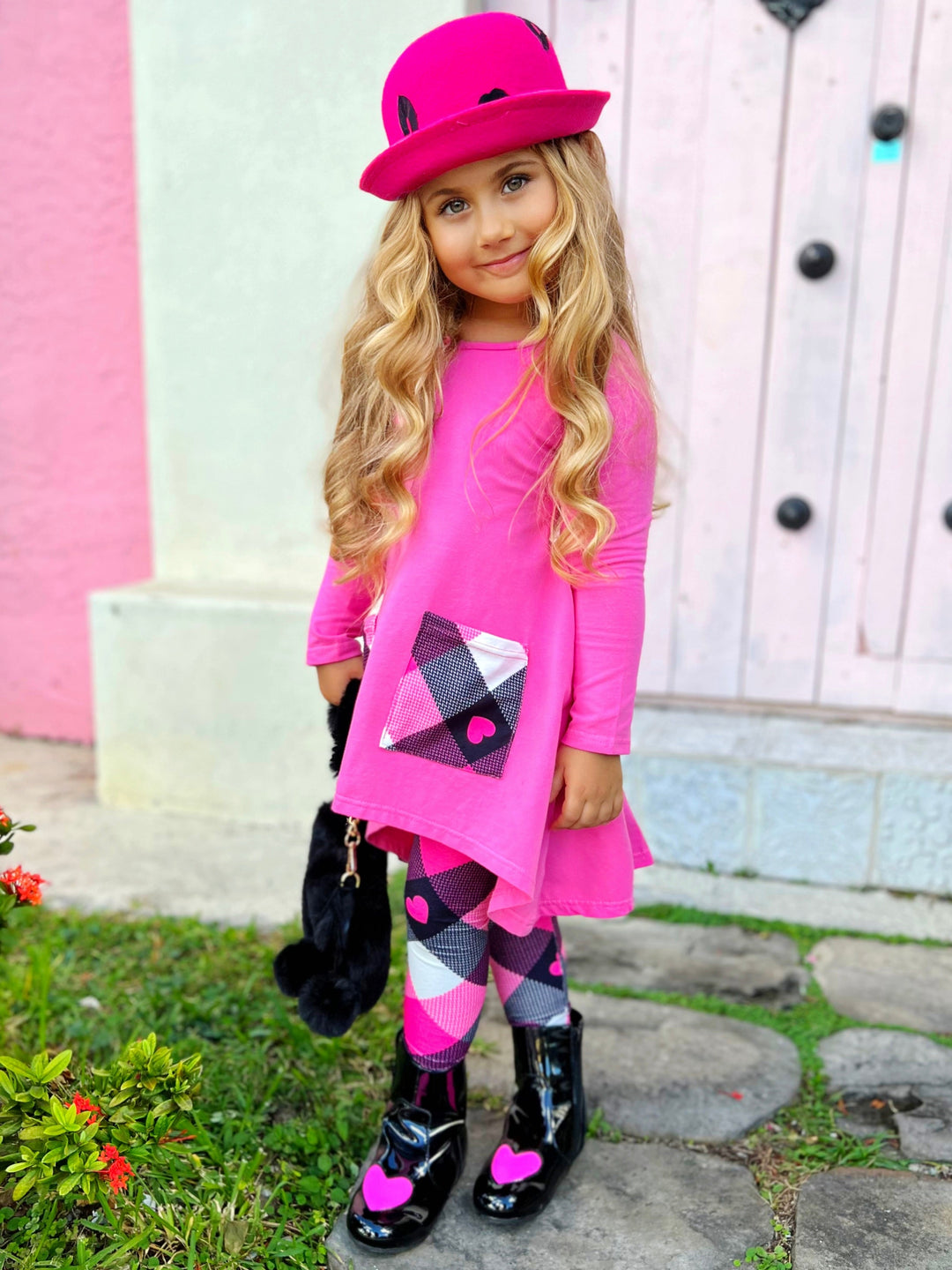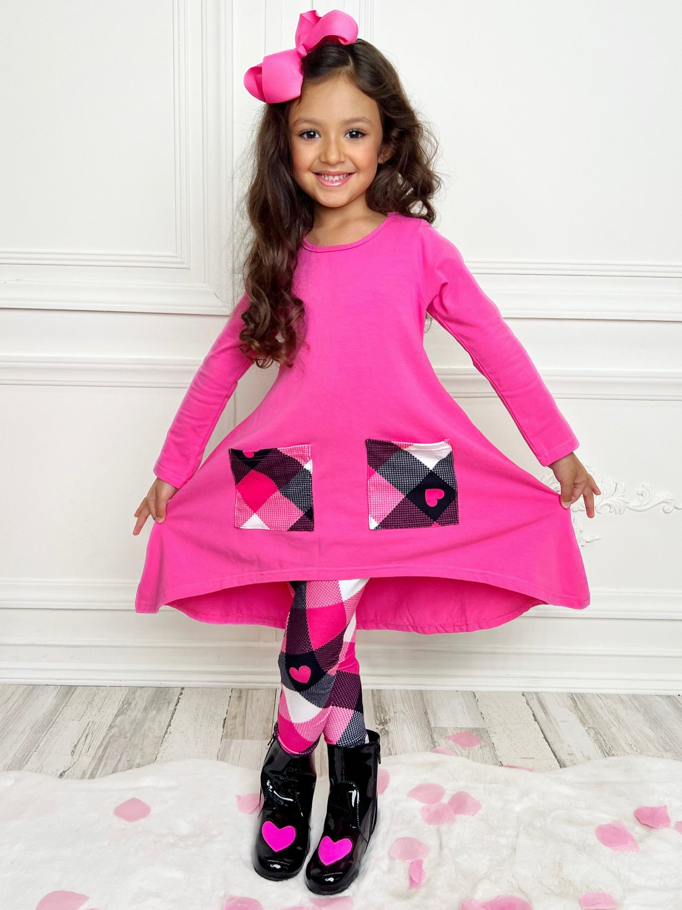 It's all LOVE and pink plaid with our pretty legging set. Designed to make her wardrobe extra sweet and charming, this hi-lo tunic with pockets to match the stretch leggings wins hearts with its adorable color mix and cute style.