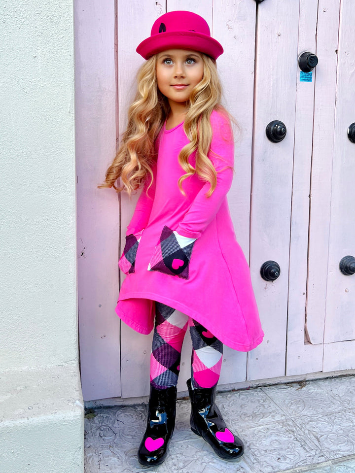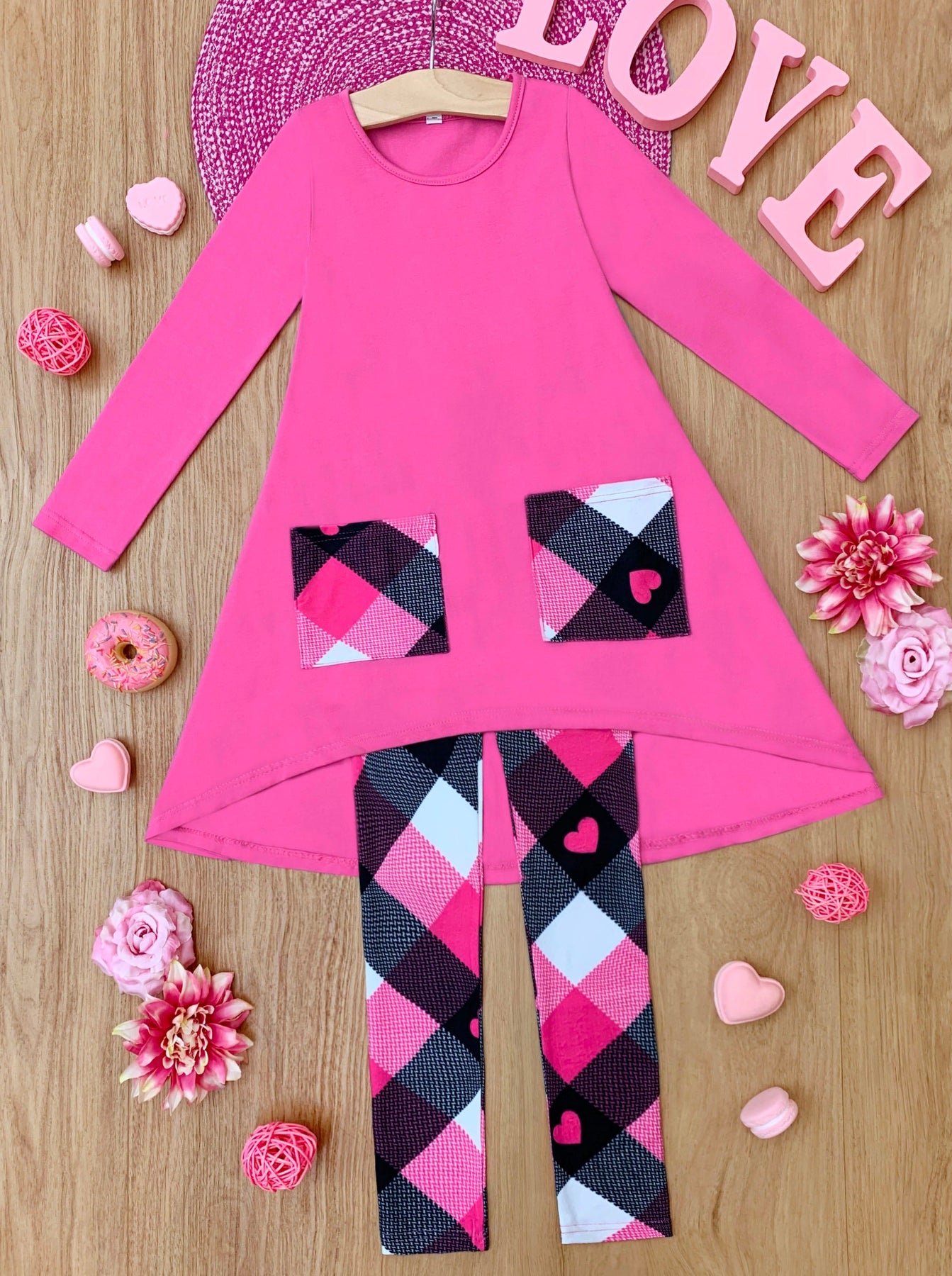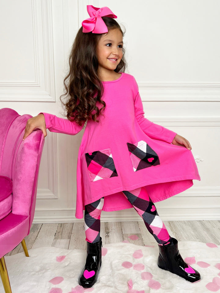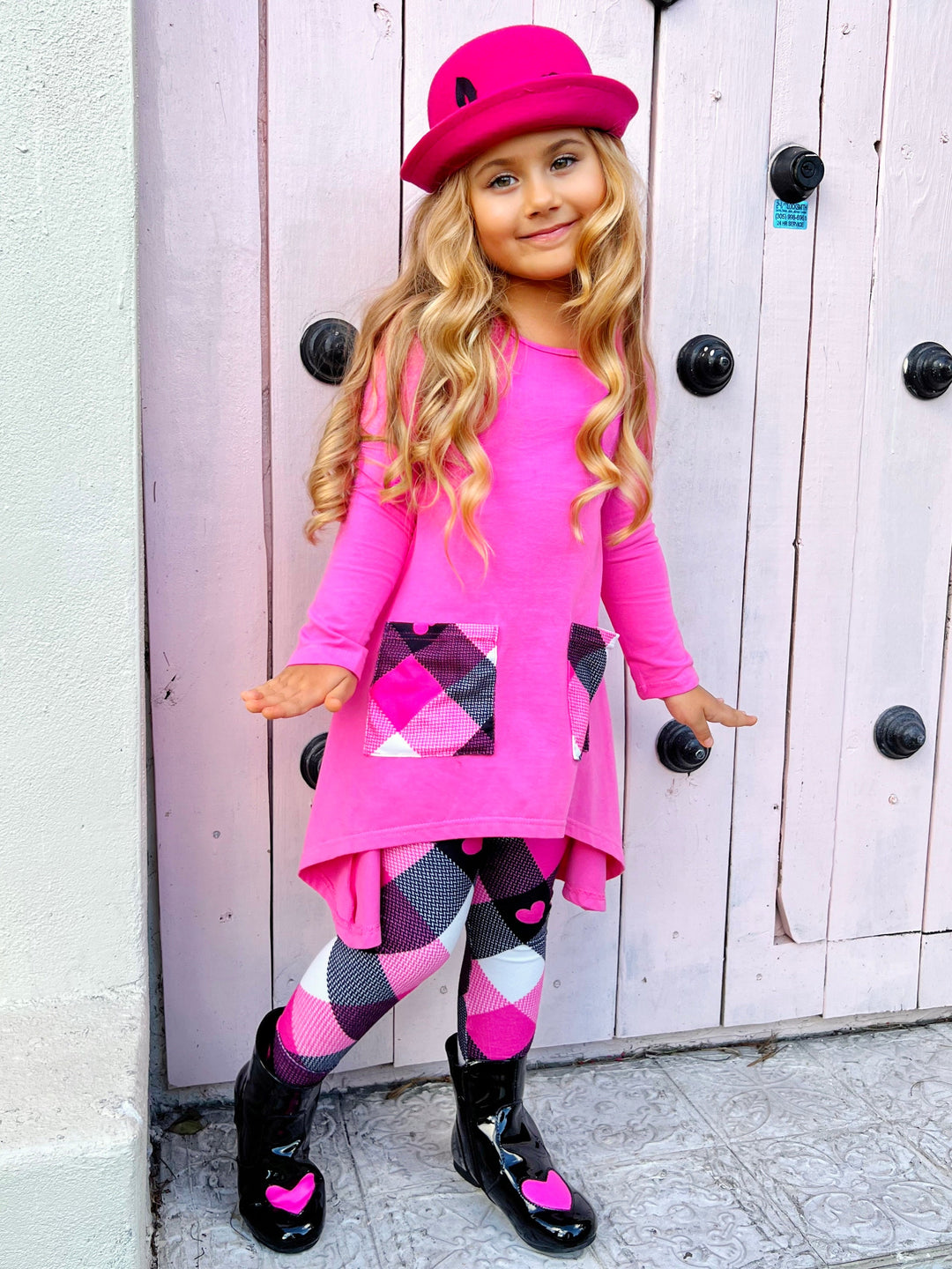 Long-sleeve hi-lo tunic with pink plaid pocket details and matching pink plaid leggings