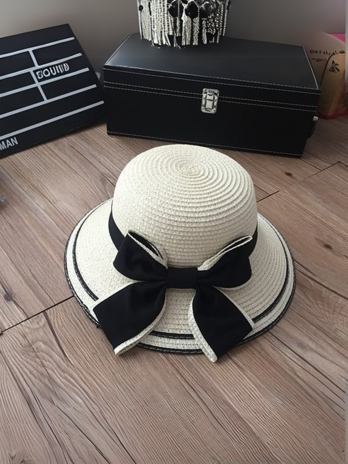 • White straw cloche hat with black accent ribbon band and brim