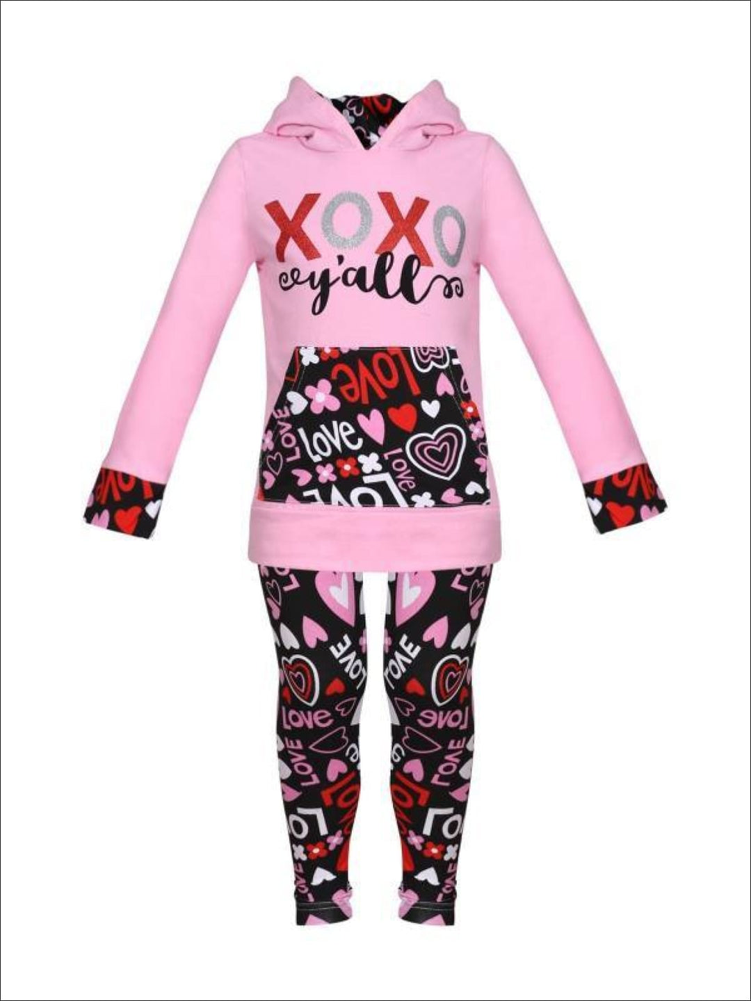 Long-sleeve pink pullover hoodie with glittery "XOXO Y'all" graphics and Valentine-themed kangaroo front pock with matching cuffs and leggings