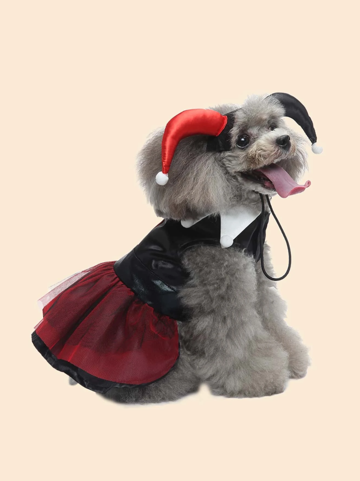 Dress your pet in this eye-catching jester costume, featuring a vibrant red and black color scheme with a matching hat, perfect for Halloween festivities.