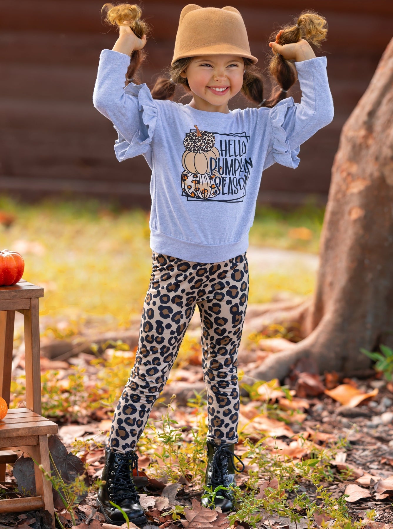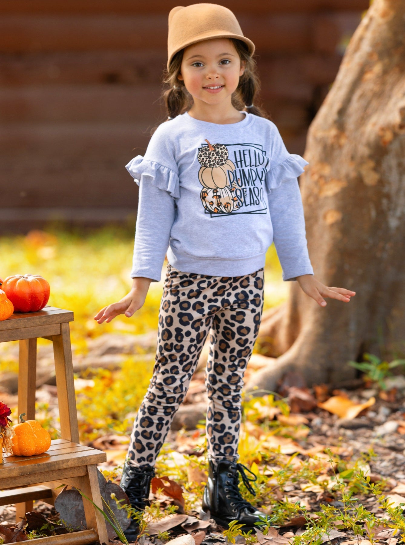- Long-sleeve pullover top with "Hello Pumpkin Season" mixed animal print graphic design, shoulder ruffles, and matching animal print leggings