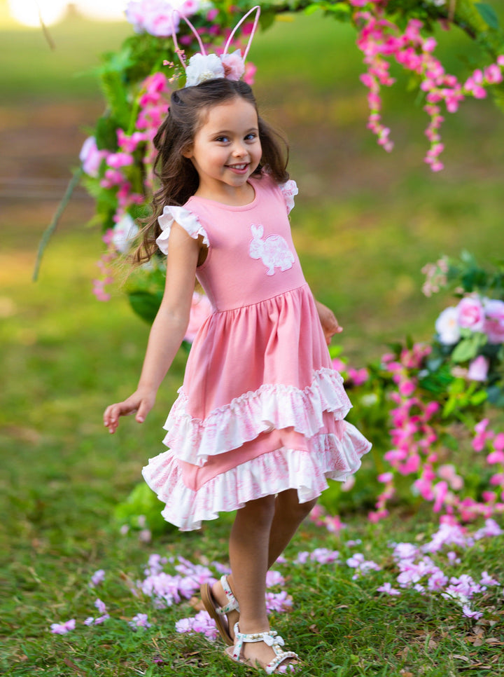 Pink flutter sleeve tiered dress with bunny embroidery and floral ruffle details