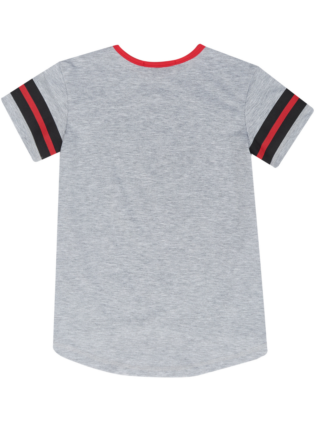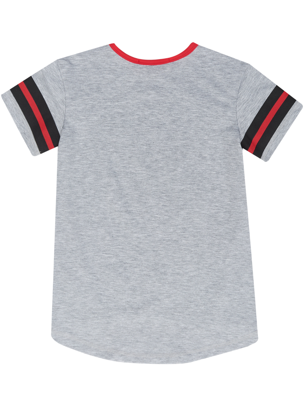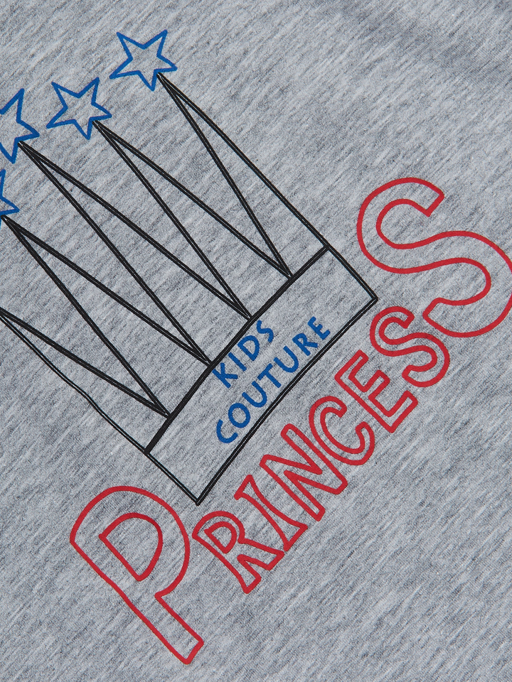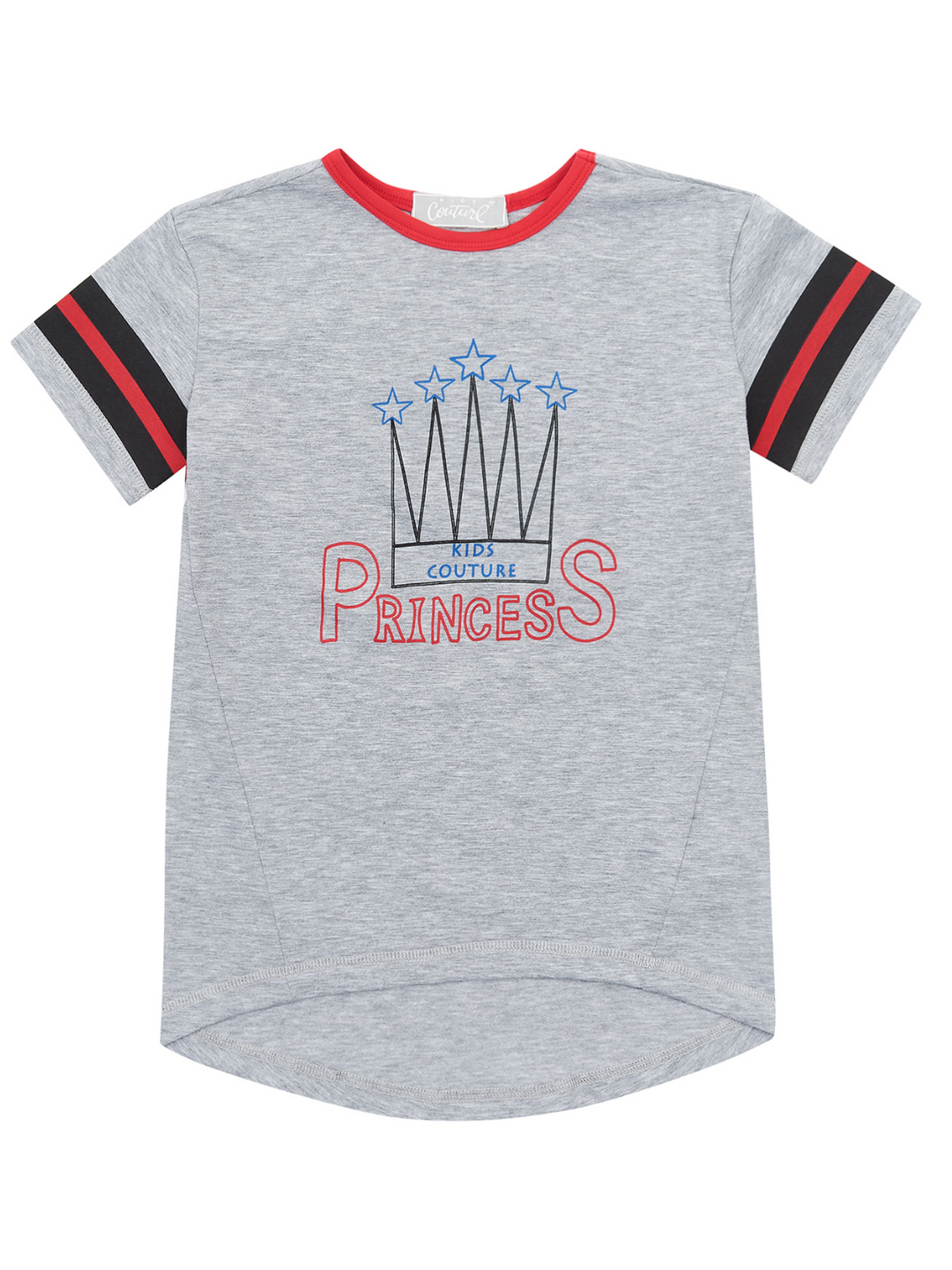 - Grey short sleeve top with striped armbands, white collar trim, and Kids Couture "Princess" graphic print design with crown and stars