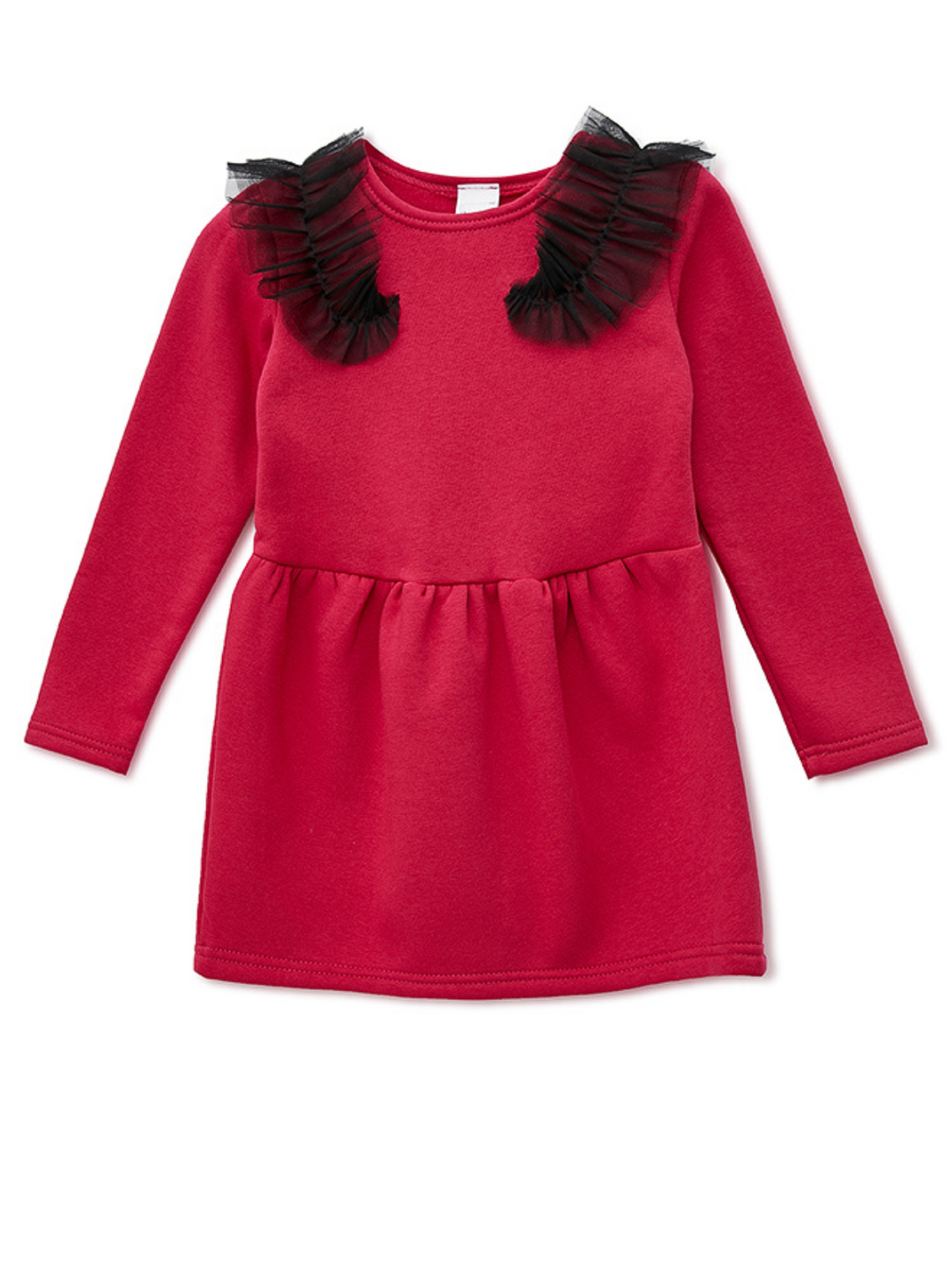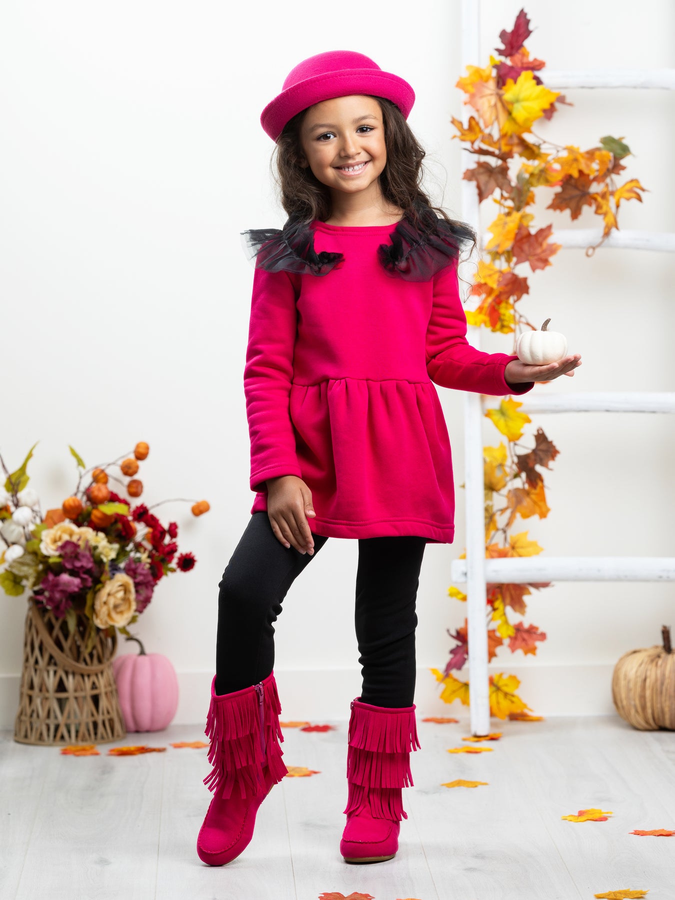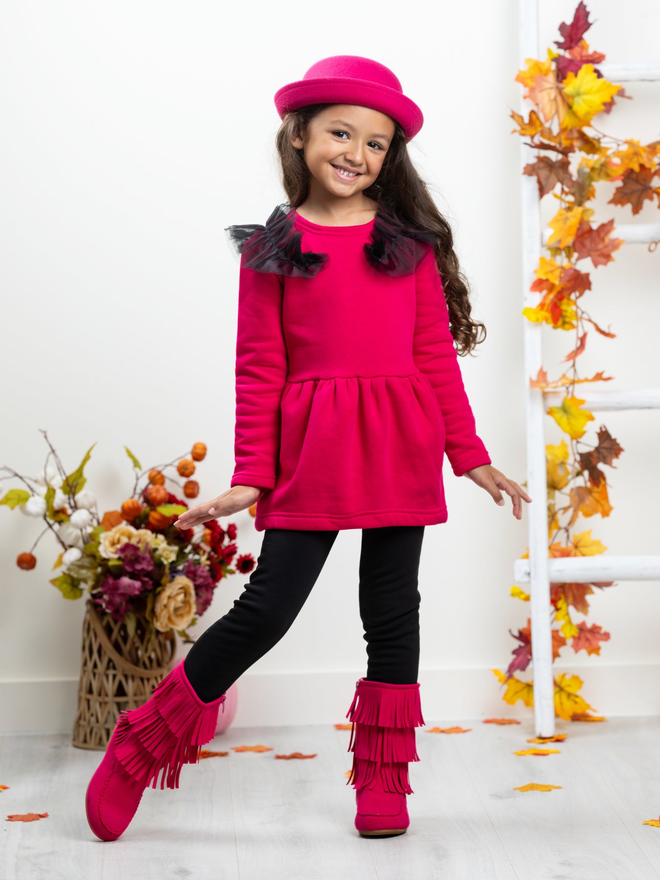 - Autumn leaves and stylish sleeves are here for our adorable casual tunic. The simple design is enhanced with frilly ruffle tulle shoulders that add a sprinkle of fancy to your little girl's everyday wear.