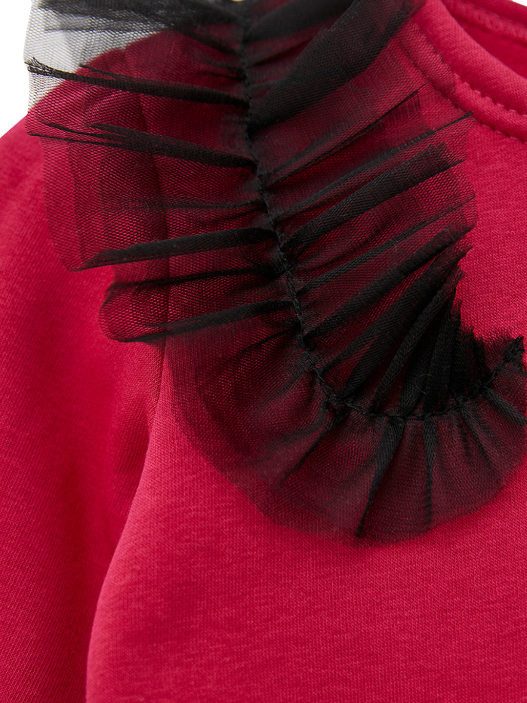 - Pink long-sleeve pullover A-line tunic with black ruffle tulle shoulder accents