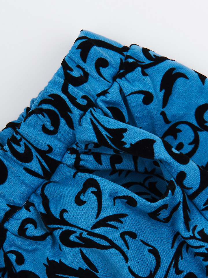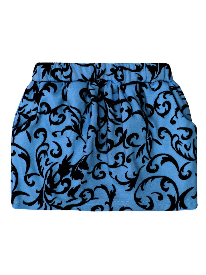 Blue stretch waist skirt with black velvet brocade vine embossing and side pockets