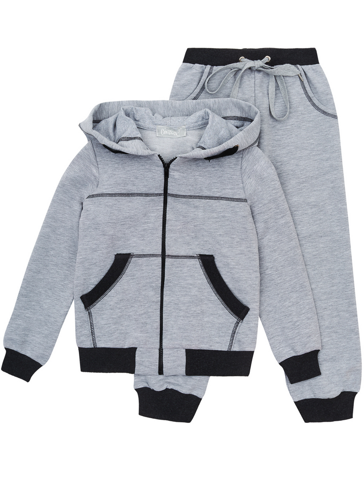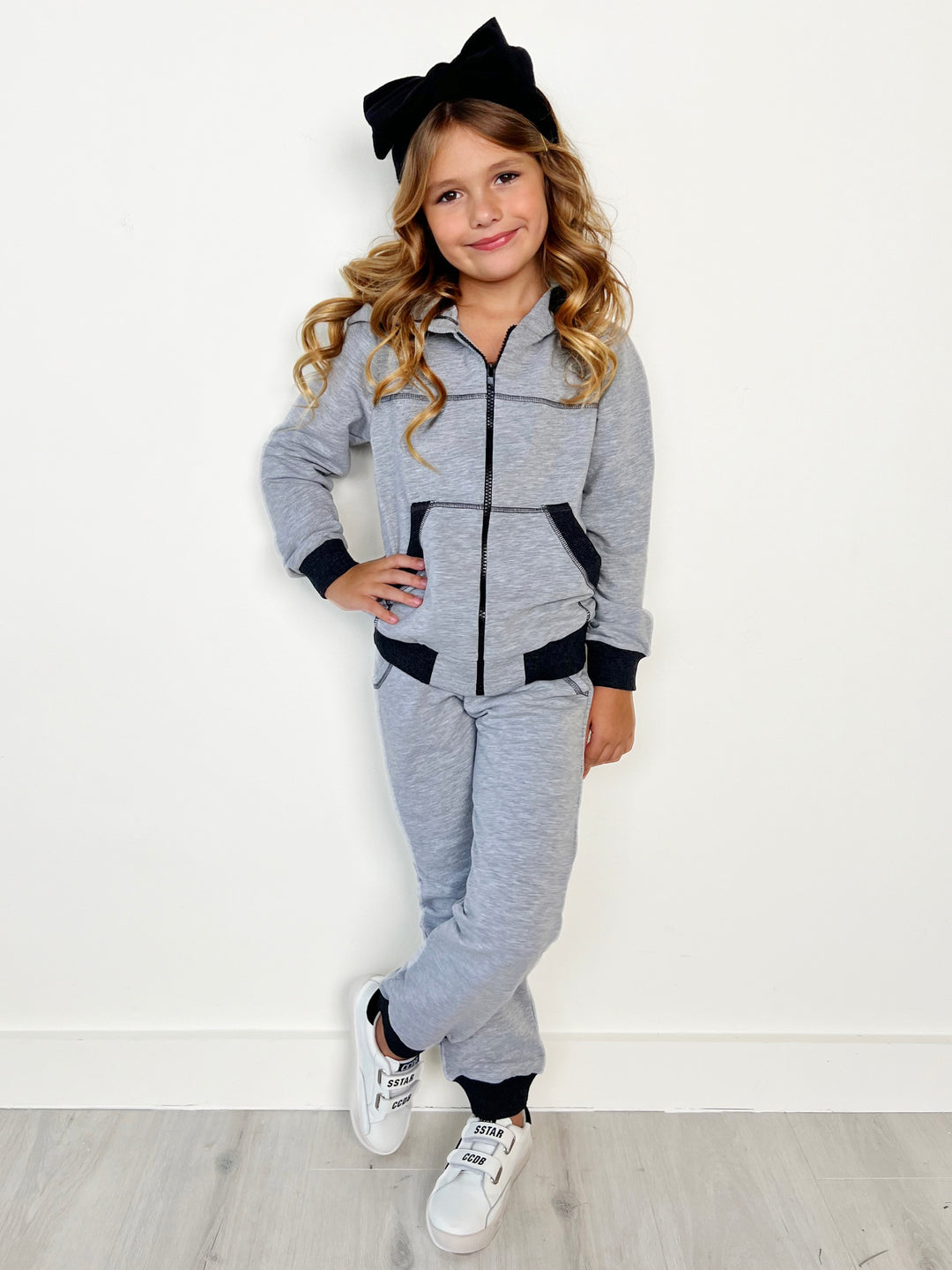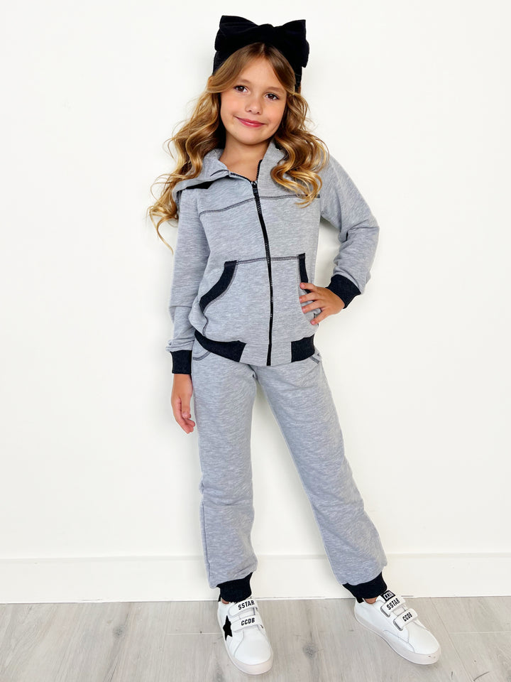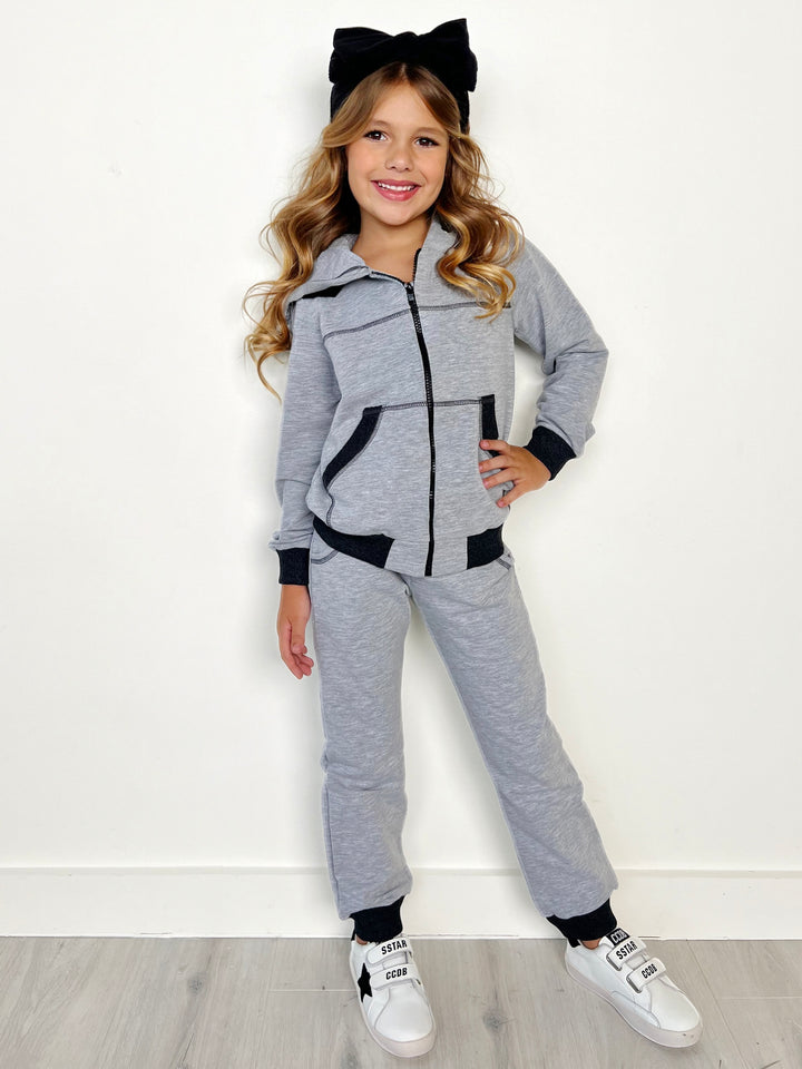 - Features a striking contrast of gray and black, adding a trendy twist to the classic jogger set.