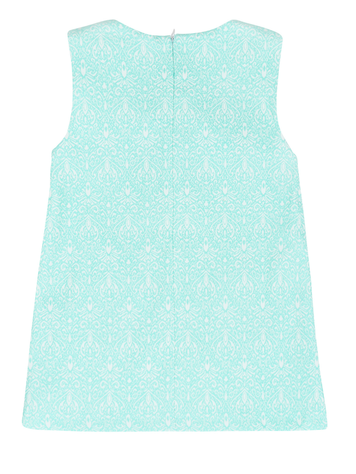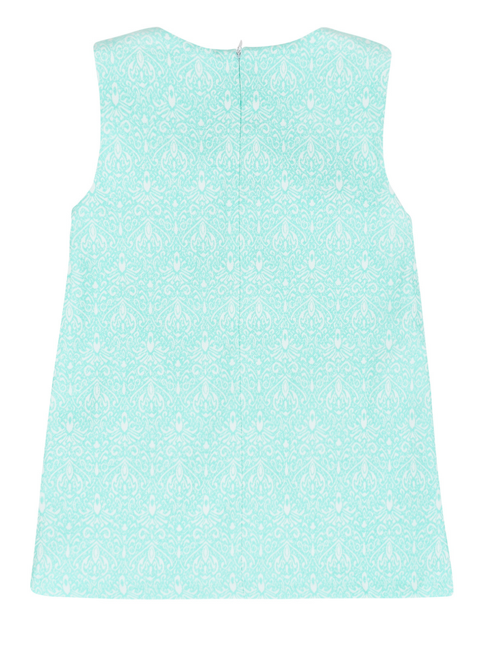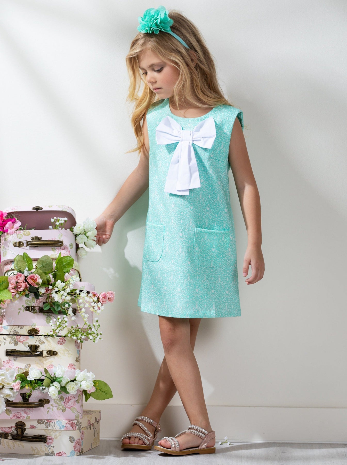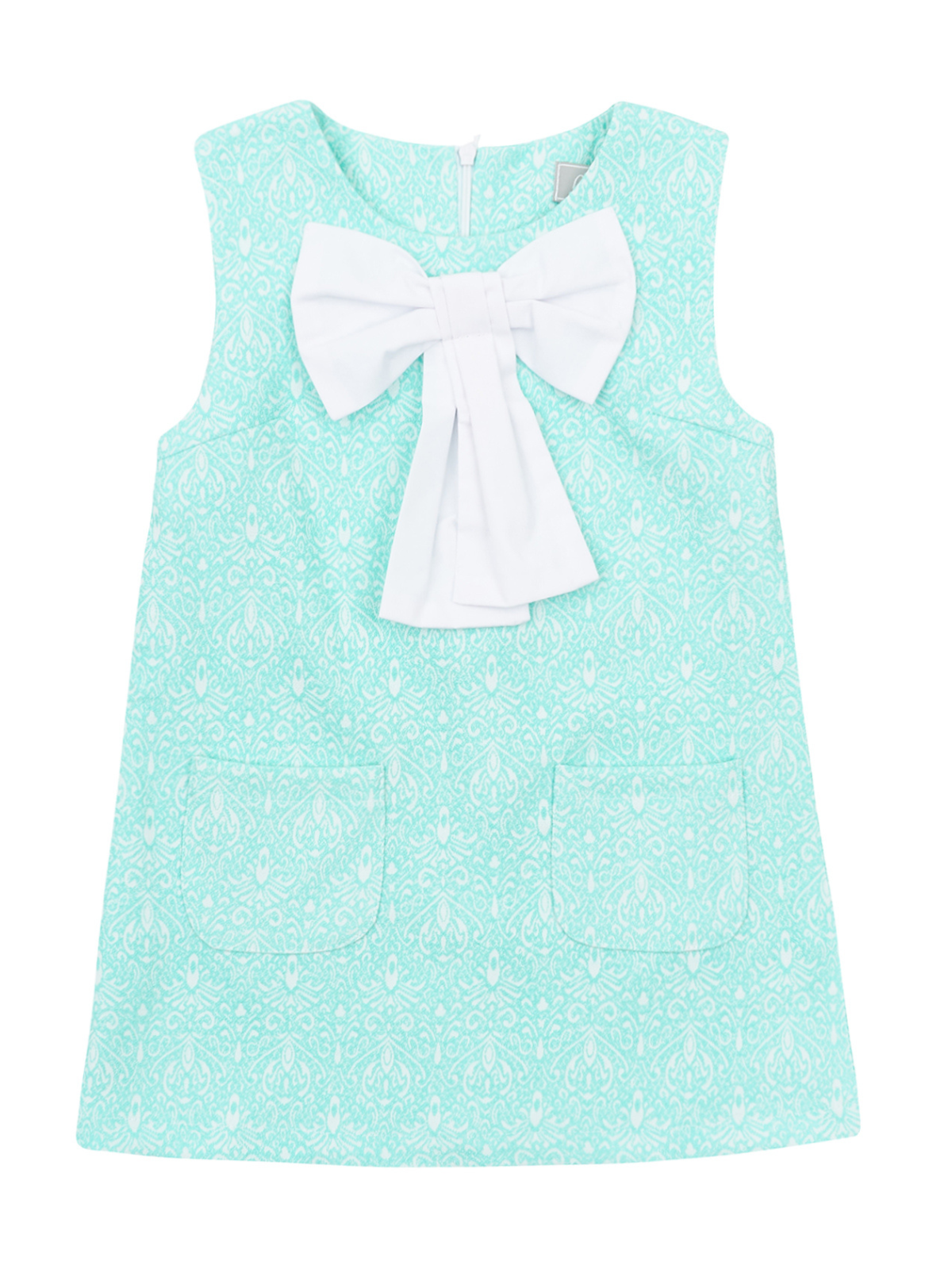 Mint jacquard sleeveless dress with big white bow at the neckline, two front pockets, and zipper in backĀ