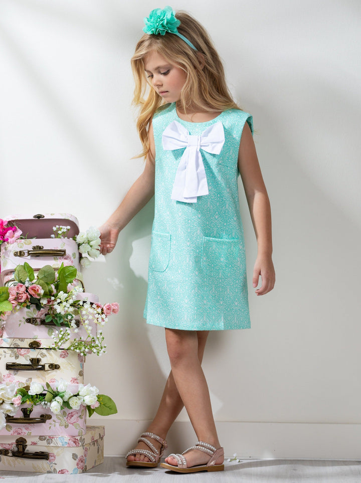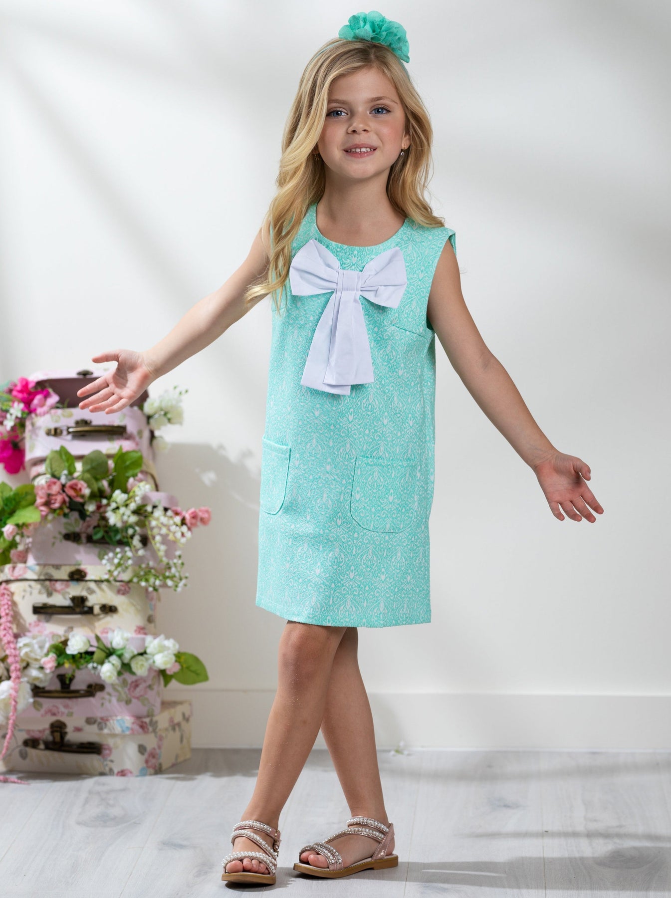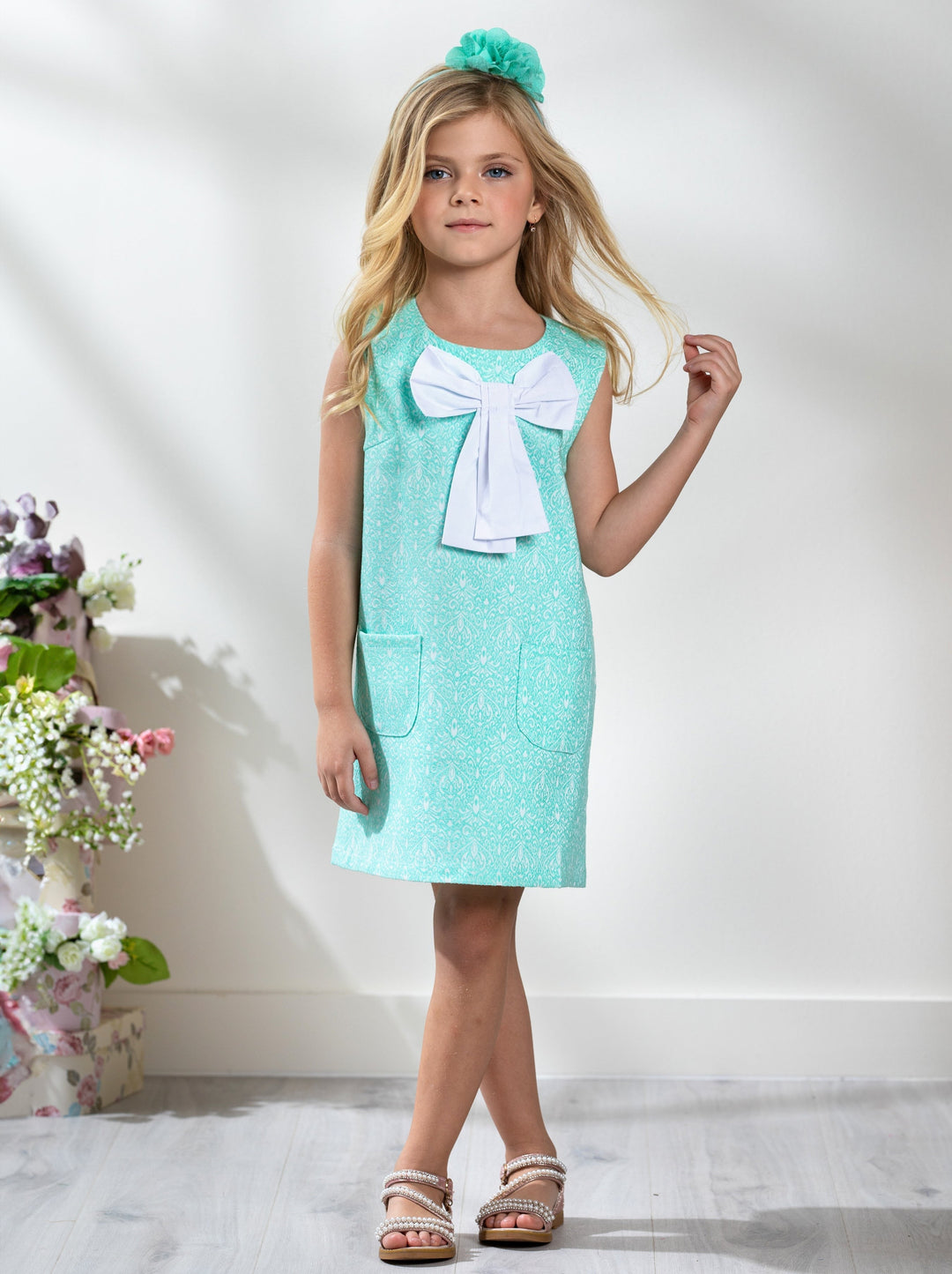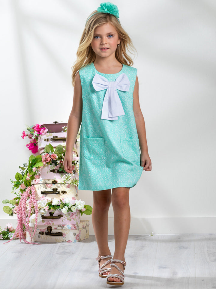 Big bow dresses are NEVER out of season. Our bright mint jacquard design is like nothing your little girl has seen before. Did we mention it has pockets?! This breathable dress's cotton blend will put your sweetie ahead of the trend.