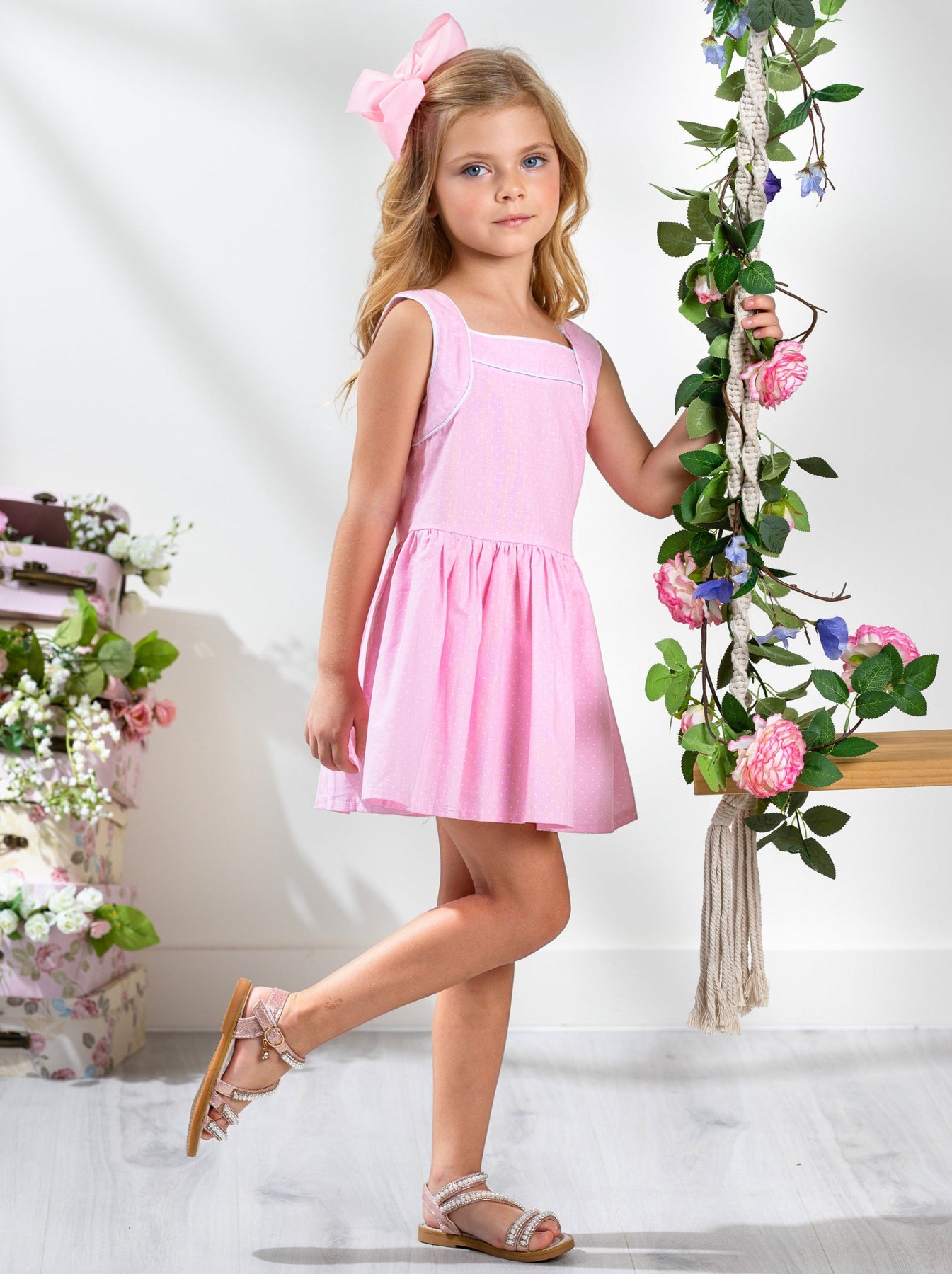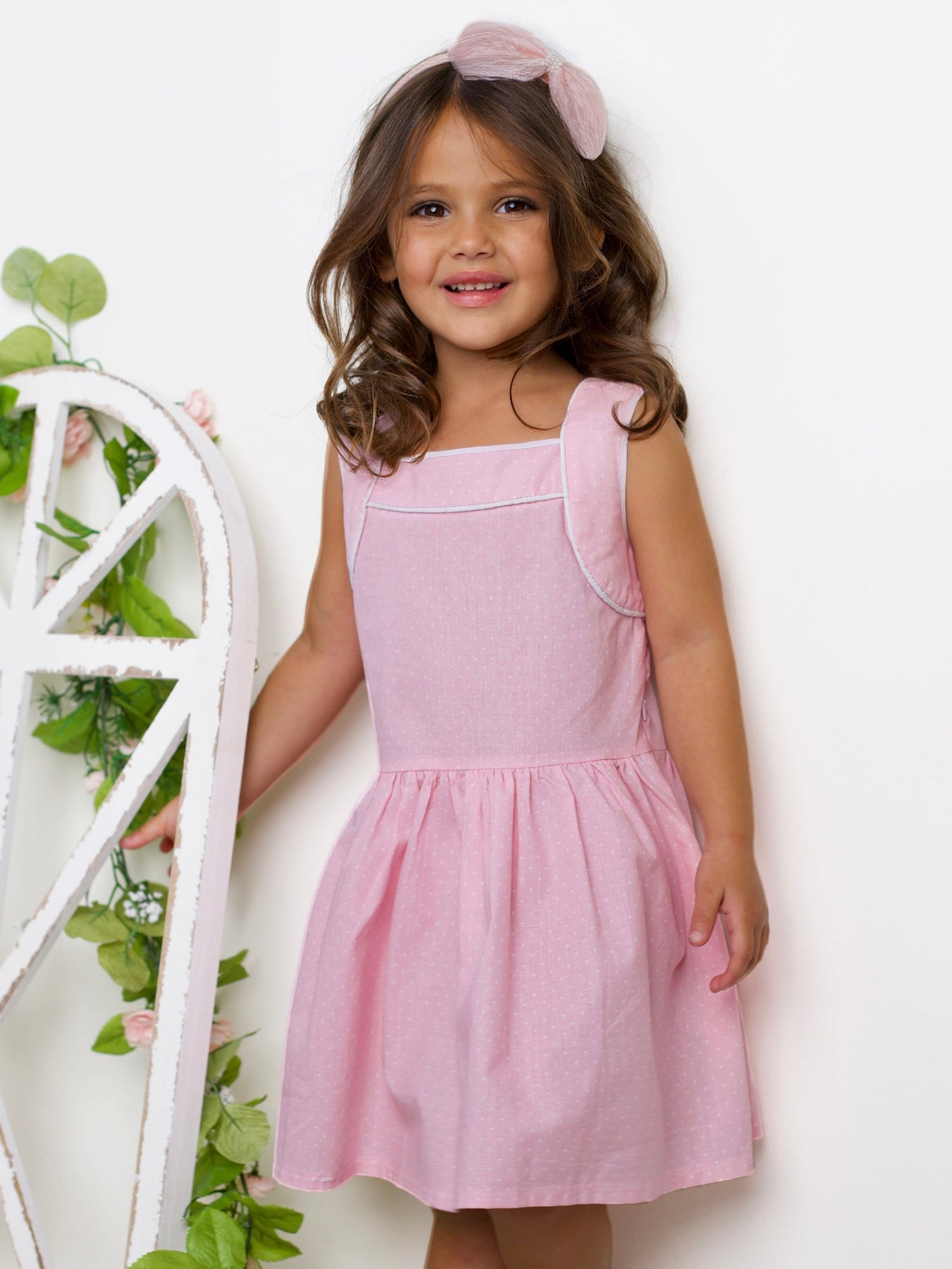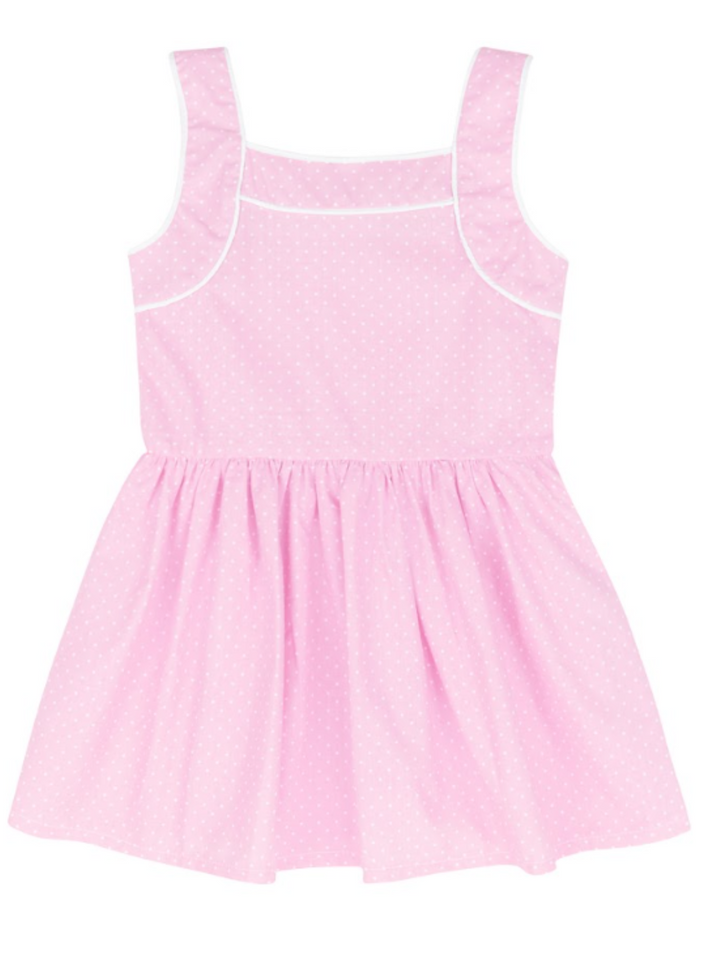 - Pink sleeveless microdot dot A-line dress with white shoulder trim, side zipper, and natural pleating at the waist